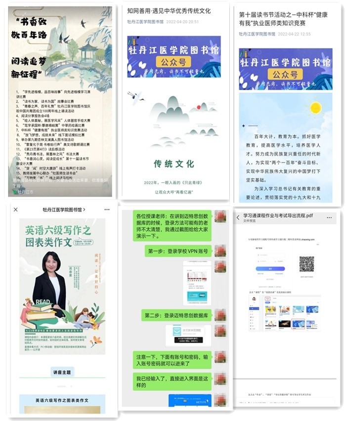 图书馆结合学生发展特点,充分拓展学生第二课堂,依托读书文化节、阅读推广、信息素养培训等活动,开展线上执业医师类知识竞赛,知网、万方等数据库使用技巧善用,英语考级系列讲座,中草药绘画比赛等活动,精心准备、广泛宣传,结合学生兴趣,提供更多的实践机会。丰富学生业余生活的同时,提升学生生信息搜集和整合能力、加深专业理解力,为学生申请科研课题、毕业论文开题和写作、各类考级、未来就业及考研打下基础。