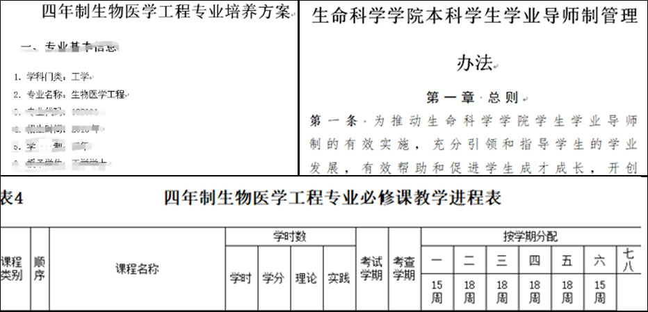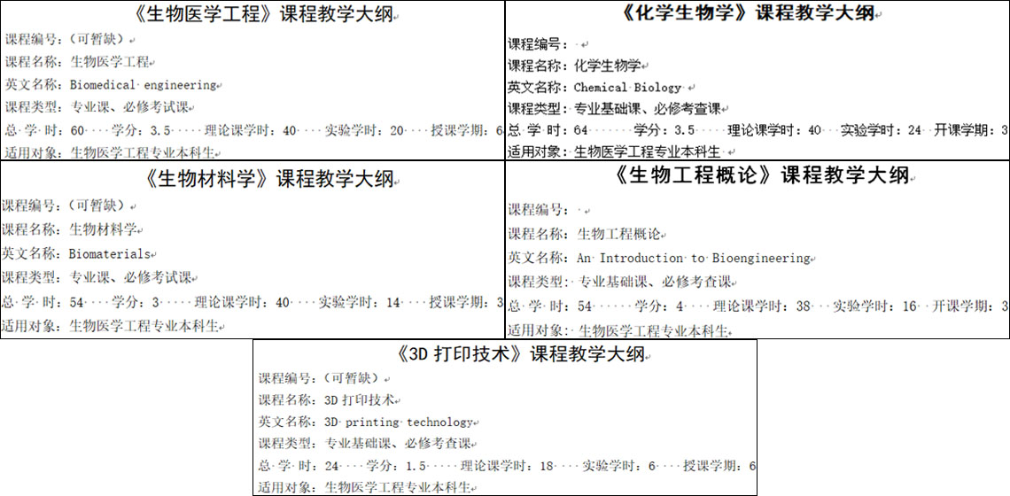 为达成人才培养目标,深化学科融合,学院与基础医学院联合建设生物信息学虚拟教研室,与医学影像学院医学图像处理教研室、影像诊断学教研室、影像设备教研室,联合开展课程体系建设,增设《生物医学工程》、《化学生物学》、《生物材料学》、《生物信息学》、《生物工程概论》、《3D打印技术》6门课程,搭建了较为完整、有机的课程体系,优化了人才培养方案,逐渐形成了“两翼一融合”人才培养模式(即:现代产业学业+专业技能大赛的创新培养平台;理医工相融合的三大核心课程体系;集专业指导、职业规划、科研创新、学习方法、教育育人为一体的学业导师制)。