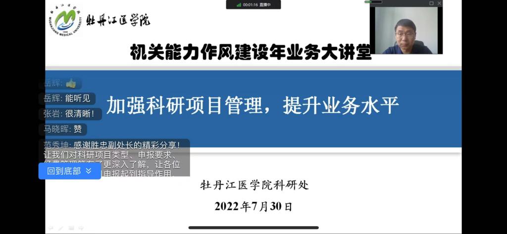 按照学校《机关“能力作风建设年”活动方案》要求,为继续推动机关广大党员干部解放思想、提升能力、转变作风,7月30日下午14:00,机关党委学习型机关创建行动之“业务大讲堂”第四讲以钉钉直播的形式在线上开讲。科研处副处长荣胜忠以“加强科研项目管理 提升业务水平”为题开展讲座,机关全体人员参加了本次讲座。