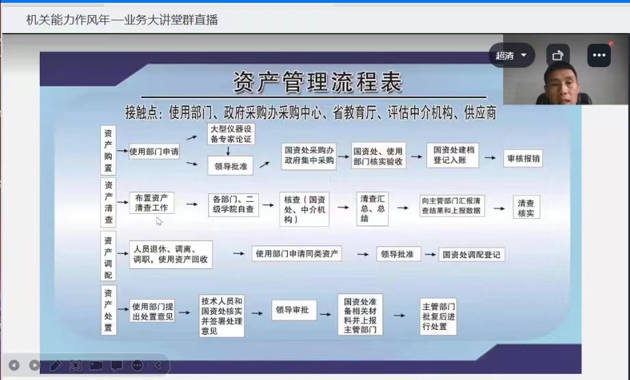 按照机关“能力作风建设年”活动方案要求,为继续推动讲学干良性互动、传帮带持续强化,不断增强机关干部的专业本领,提高工作效率,10月28日下午,实施学习型机关创建行动之“业务大讲堂”第七讲以钉钉直播的形式在线上开讲。国有资产管理处副处长邹辉以《熟悉招标采购流程,提高工作效率》为题开展专题讲座,机关人员参加了本次讲座。