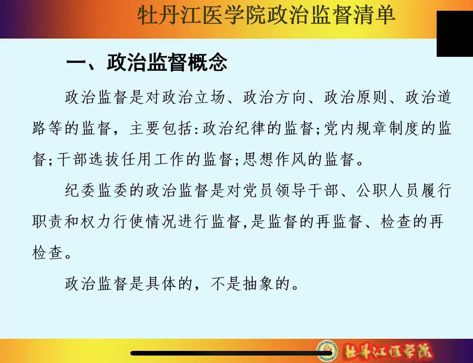 王建林首先介绍了政治监督的概念,其次,围绕机关工作实际,结合牡丹江医学院政治监督重点内容清单的内容展开深入讲解,细致剖析,主要包括贯彻落实党的二十大精神和习近平总书记关于高等教育工作的重要论述和重要指示批示精神、贯彻落实为党育人为国育才使命和立德树人根本任务、落实全面从严治党责任,保证权力在正确轨道运行等方面。