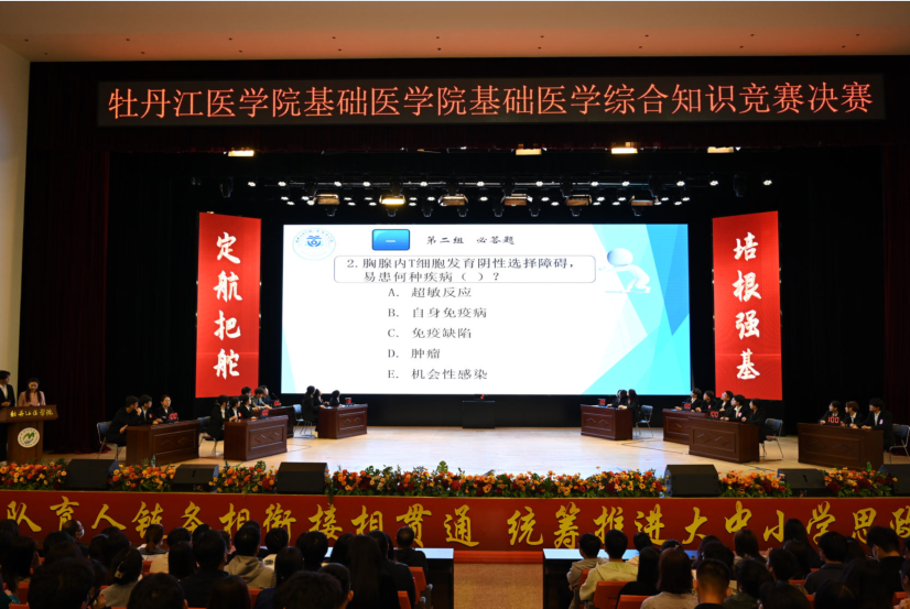 为进一步丰富拓展学习贯彻习近平新时代中国特色社会主义思想主题教育学习形式,营造基础医学院良好学风,激发学生学习兴趣,检验学习成果,2023年6月2日,基础医学院在文体馆展播厅举行了基础医学院基础医学综合知识竞赛决赛。基础医学院党委书记孙荫众、院长李丽、院领导班子成员、九个教研室特邀专家、临床专业辅导员,以及8个参赛班级临床专业学生出席本次活动。