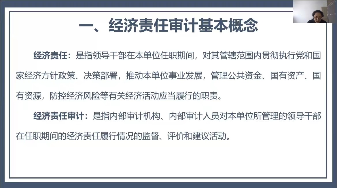 崔丽萍结合工作开展实际,从内部审计的角度为大家介绍了经济责任审计的相关内容,主要包括经济责任审计的基本概念、目标、对象、工作原则、审计的程序、内容及责任认定等方面,并针对经济责任审计涉及的内容,详细讲解了同大家实际工作密切相关的八个方面,主要包括贯彻执行党和国家经济方针政策及决策部署情况审计、发展战略规划制定及执行情况审计、重大经济事项决策及执行情况审计、组织治理情况审计、财政财务管理情况审计、党风廉政建设责任和个人遵守廉洁从业规定情况审计等方面。