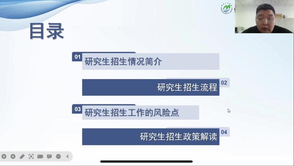 冯文旭结合工作开展实际,分别对我校研究生招生情况、研究生招生流程及风险点等方面进行政策解读。其中,重点介绍了研究生招生工作中面临的风险点,由于研究生招生工作涉及的政策文件多,招生类型多;人员多,管理难度大;考生来源复杂,政策理解角度多样等六方面原因,导致研究生招生工作中存在的风险点随之增多。培训中,冯文旭又结合近年来与研究生招生工作相关的重点案例、舆情热点进行风险点的系统梳理,并提出了行之有效的规避措施。