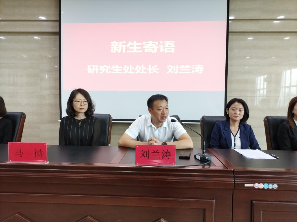 研究生处处长刘兰涛首先代表研究生处全体教师对新同学的到来表示热烈欢迎。他希望新同学们在牡医能有三点收获:收获专业知识、收获科研成果、收获实践能力。同时也向他们提出三点要求:要热爱科研,锤炼过硬科研本领;要敢于挑战,提升独立研究的能力;要志存高远,为勇担时代重任不懈攀登。