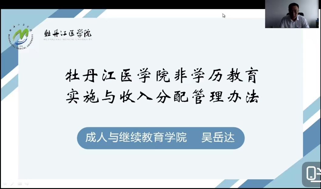 非学历教育作为高校人才培养的重要组成部分,是推动构建学习型社会的关键环节。机关党委以深化能力作风建设“工作落实年”之“业务大讲堂”活动的开展为契机,于9月27日诚邀成人与继续教育学院学生科科长吴岳达以《牡丹江医学院非学历教育实施与收入分配管理办法》为题开展专题业务讲座。机关党委人员通过钉钉线上参与收听收看,获益良多。