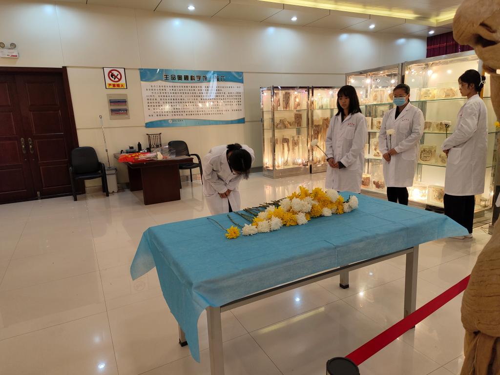 参加活动的全体师生整齐列队,李明秋为师生讲解了世界解剖日的起源,并以此纪念“解剖学之父”安德烈·维萨里的光辉成就。随后全体师生依次向大体老师敬献鲜花,由解剖教研室主任杨春壮领诵、大家齐诵解剖学誓词,致敬在医学生学习成长道路上默默奉献的“无言良师”。