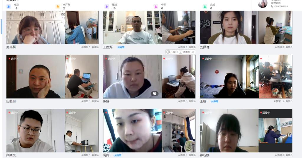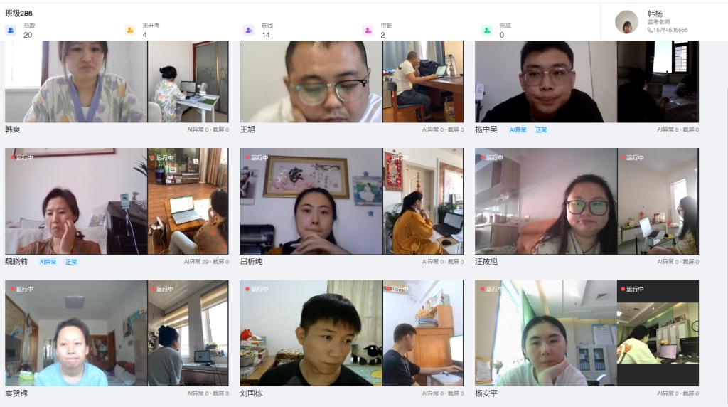 4月21日8点15分前,全体监考员在监考系统签到上线, 逐一检查考生的摄像头、环境音等,确保考生考试全程在有效的监控范围内,在考试过程中,全体监考员恪尽职守,严抓考风考纪,为学生创造良好考试环境。