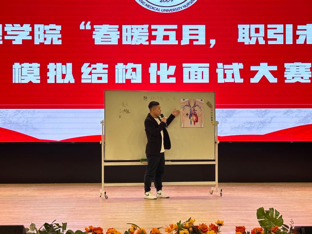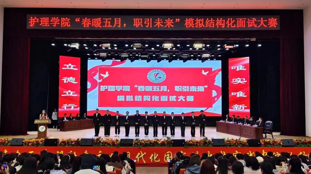 为了积极响应教育部《2024届全国普通高校毕业生就业创业促进行动》,促进大学生尽早了解用人单位招聘考试需求,端正就业择业观念,提高职业生涯规划能力,掌握丰富的应聘技能,护理学院于5月7日18时在学校文体馆举办“春暖五月,职引未来”模拟结构化面试大赛。大赛由护理学院实习就业科、团委联合举办,校招生就业处处长王廷华、校团委书记王新,护理学院副处级辅导员张春丽、护理学院实习就业科科长曹文超、护理学院教务科科长高鸾、护理学院团委书记孟晨担任了本次大赛的评委,2021级学生范思惟主持了本次大赛。