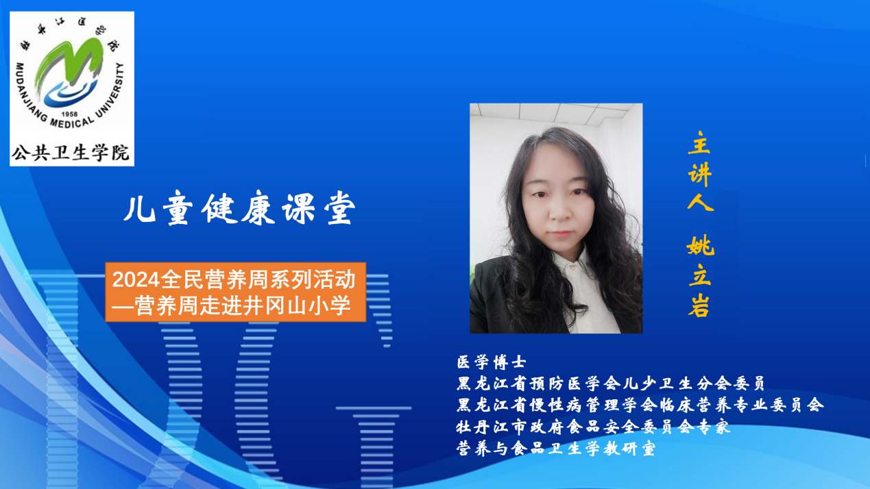 5月15日上午8:30至9:30,营养与食品卫生学教研室姚立岩博士为井冈山小学的同学们带来了以“儿童健康课堂”为主题的科普讲座,以生动有趣的方式向同学们解释了为什么要吃多种颜色的蔬果、如何选择健康零食、如何避免高脂高盐高糖食品等营养健康知识。她还特别强调了足量饮水、多运动和保证充足睡眠对健康成长的重要性。5月16日下午14:30至15:30,姚立岩博士为立新小学的同学们带来了主题为“如何养成健康好习惯”的科普讲座。两所小学的同学们积极与老师互动、踊跃发言,现场氛围热烈而融洽。