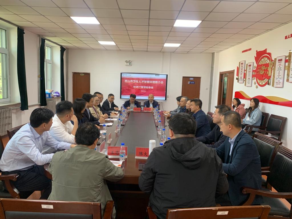 5月28日,昆山市卫健系统高层次引才专场推介会在牡丹江医学院招生就业处多功能厅举办。昆山市卫健委党委委员、昆山市疾控中心主任钱国华、昆山市卫健委组织人事科科长张奕、昆山市卫生人力资源中心副主任陈岑及昆山市第三人民医院、第四人民医院、第六人民医院、康复医院、锦溪人民医院、锦溪镇社区卫生服务中心、张浦镇社区卫生服务中心、周市镇社区卫生服务中心相关负责同志参加此次推介会。学校招生就业处处长王廷华、副处长刘宾娜,第一临床医学院正处级辅导员赵峰,公共卫生学院党总支副书记孙延斌、研究生处党总支书记赵君嫦、医学影像学院副处级辅导员宋海南一同参加洽谈会。会议由招生就业处处长王廷华主持。