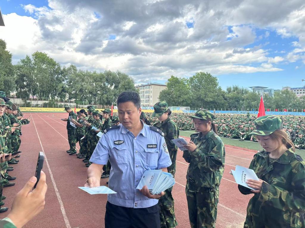 2024年8月26日,武装部(保卫处)联合爱民分局、向阳派出所,在校体育场向新入学24级新生开展了2024年“开学第一课”反诈宣传,爱民分局反诈大队范旭朋警官对防范电信网络诈骗的方式方法进行了普及。针对近期高发的裸聊敲诈勒索案件、冒充公检法诈骗、网络购物冒充电商诈骗、注销“校园贷”“京东金条、白条”消除不良征信等诈骗方式进行了详细讲解。