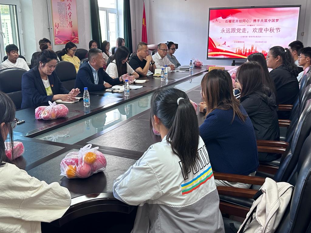为进一步落实习近平总书记铸牢中华民族共同体意识,推进新时代党的民族工作高质量发展重要讲话精神,引导学院各族学生牢固树立休戚与共、荣辱与共、生死与共、命运与共的共同体理念,在中华人民共和国成立75周年之际和中秋佳节来临之际,2024年9月13日,卫生管理学院召开“石榴花开结同心,携手共筑中国梦”—少数民族一家亲学生座谈会,学院党委书记魏赟鹏、院长师东菊、副处级辅导员张久涛、樊俊杰、团委负责人李晓晨参加座谈。