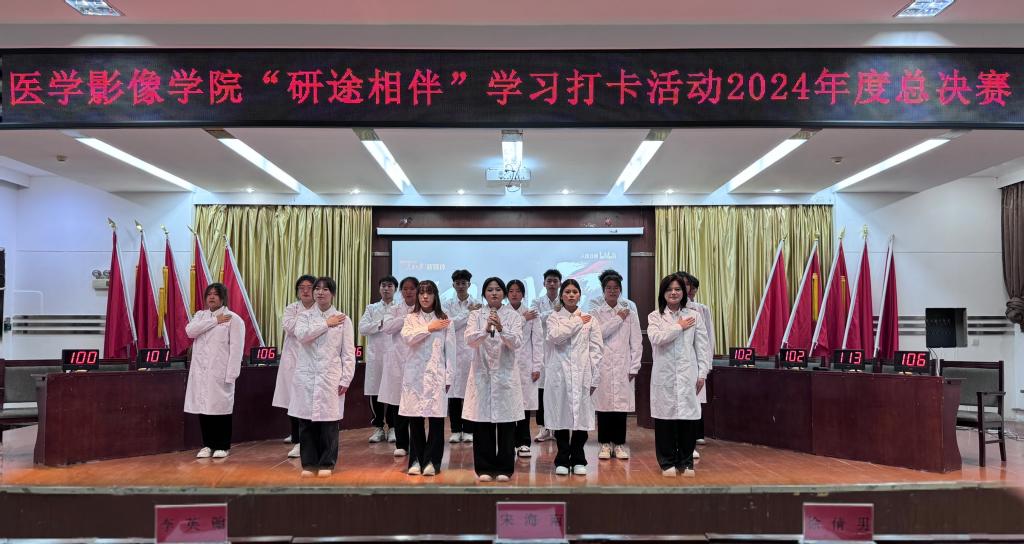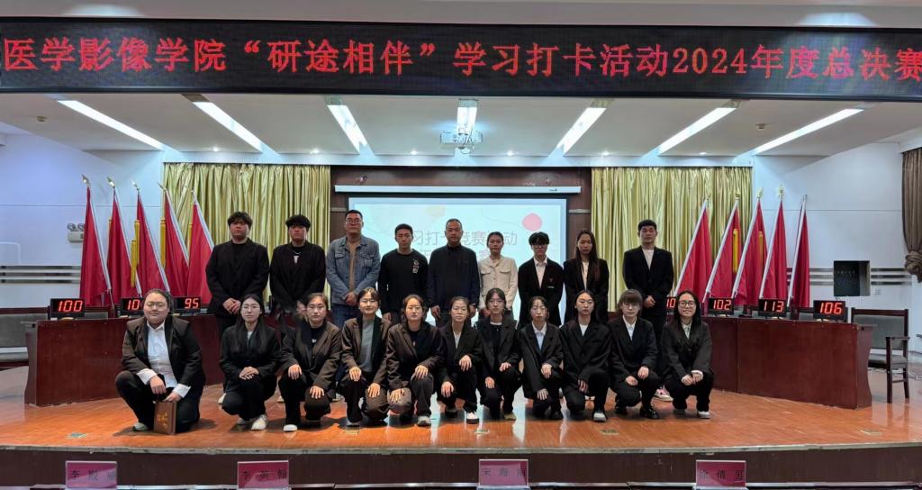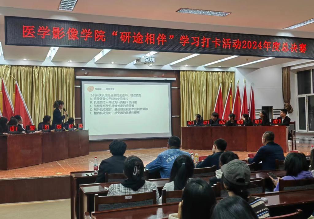 学以共进,研以致远。为进一步提升学生深入学习的能力,拓展考研知识领域,激发同学们的考研热情,引导学生多读书、深思考、善提问、勤实践,将学风建设与学生成长成才教育紧密结合起来。2024年9月24日,医学影像学院在基础楼多功能厅举办“研途相伴”学习打卡活动暨“研途掌舵人”年度总决赛。医学影像学院副处级辅导员宋海南及辅导员李英翰、李殿威、徐倩男受邀参加此次活动。