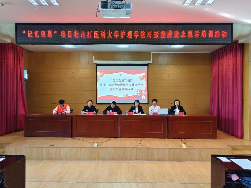 2024年9月29日,在牡丹江医科大学图书馆四楼报告厅开展北京韩红爱心慈善基金会“记忆包裹”项目牡丹江医科大学护理学院对接授牌暨志愿者培训活动。牡丹江市雨初社会组织发展服务中心作为“记忆包裹”项目执行机构为护理学院授旗,红旗医院神经内三科主任赵维纳开展专业知识培训,护理学院副处级辅导员张春丽、实习就业科科长曹文超、团委书记孟晨、辅导员赵健博以及110名大学生志愿者参加本次活动。