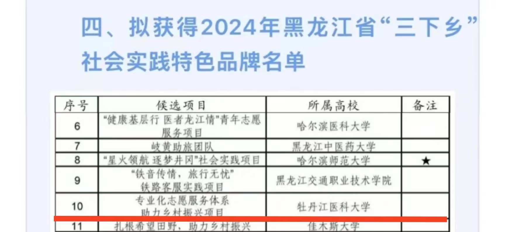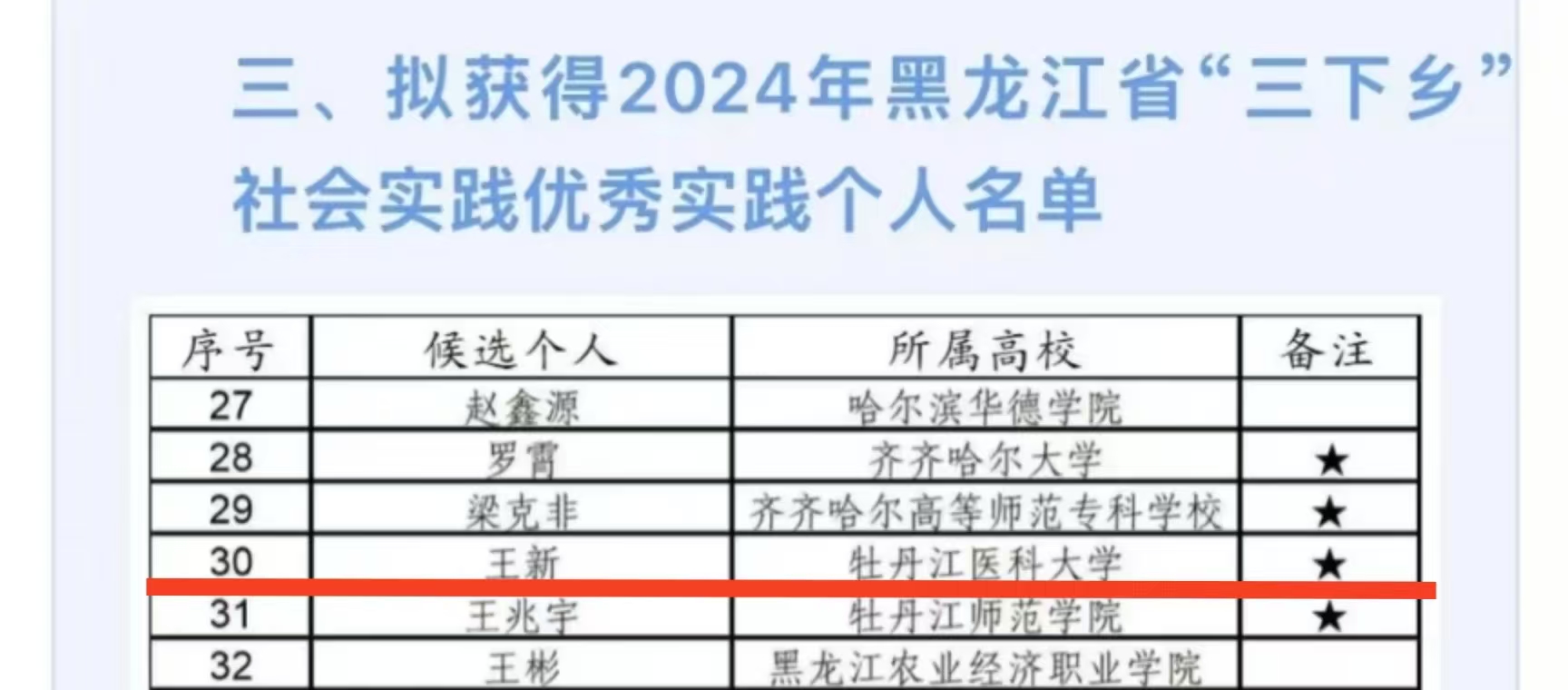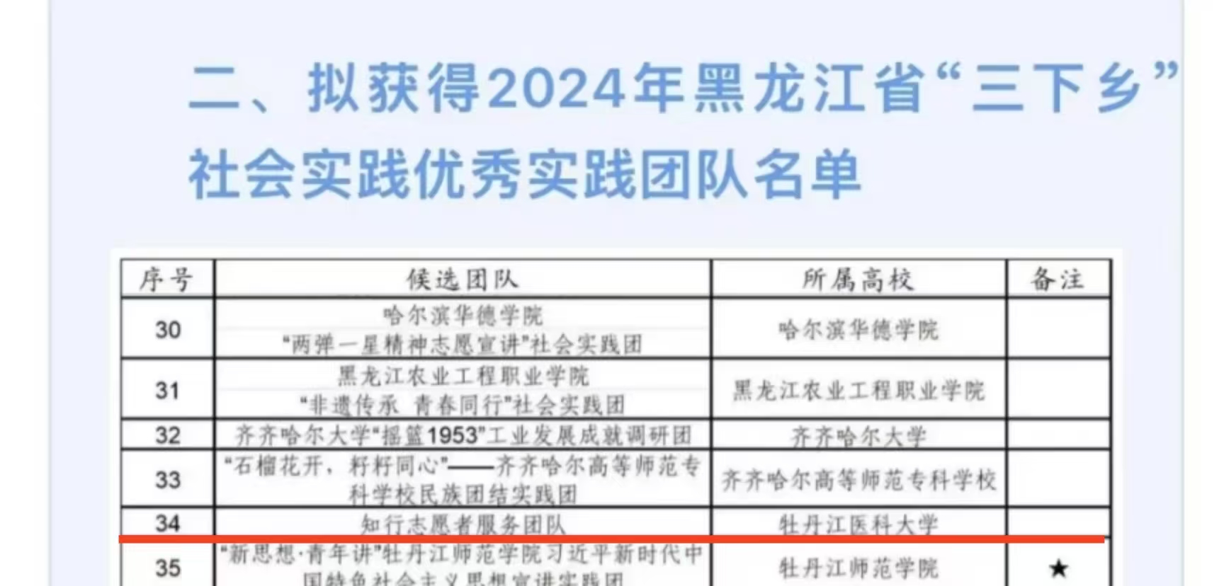 近日,共青团黑龙江省委对2024年黑龙江省大中专学生志愿者暑期文化科技卫生“ 三下乡”社会实践活动典型进行公示,我校专业化志愿服务体系助力乡村振兴项目获评“特色品牌”。知行志愿者服务团队获评“优秀实践团队”、校团委书记王新获评“优秀实践个人”。其中,王新将作为黑龙江省2024年度全国大中专学生志愿者暑期文化科技卫生“三下乡”社会实践活动拟推荐对象,在全国范围内进行评选。