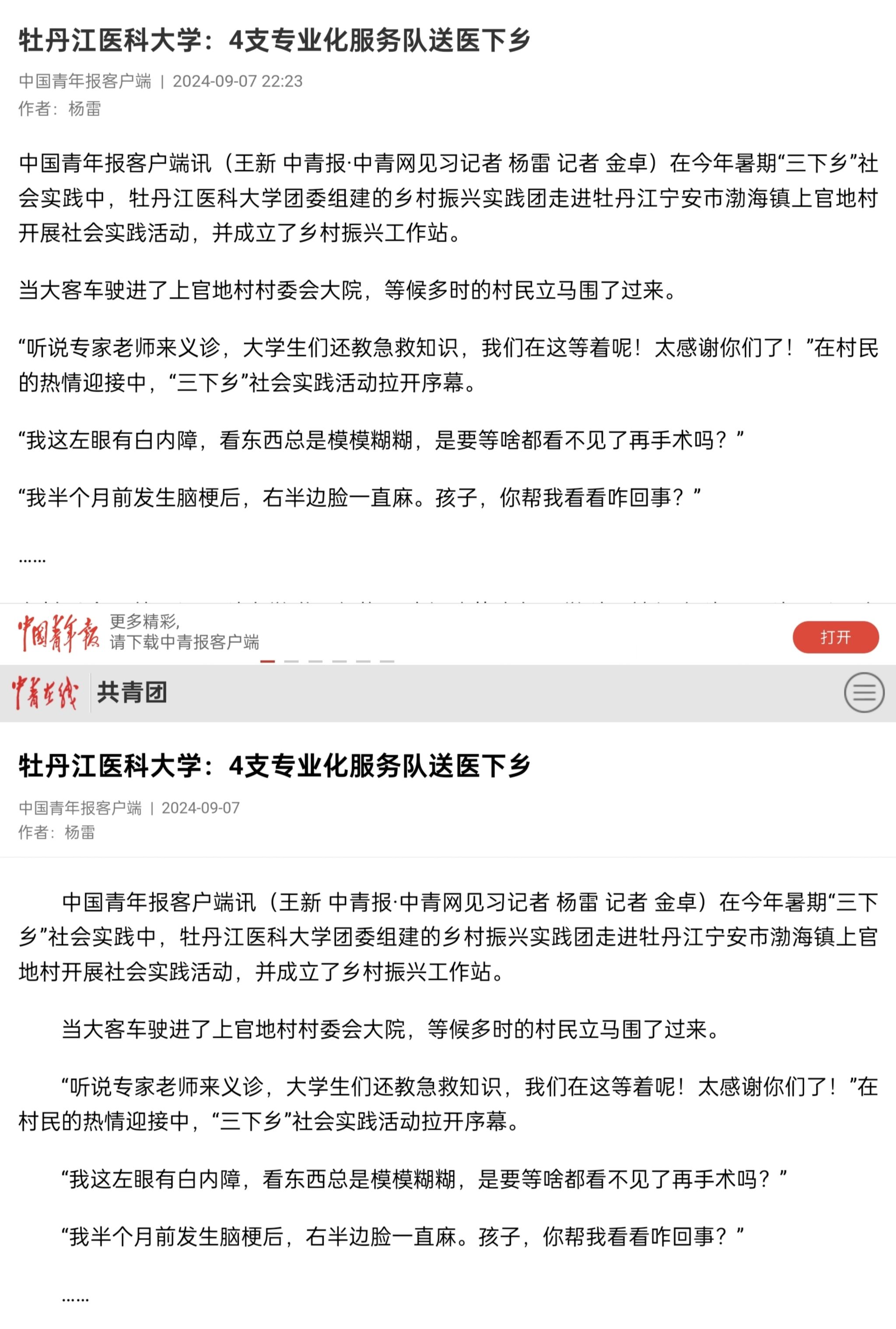 我校专业化志愿服务体系助力乡村振兴实践团项目得到了多家媒体和社会各界的广泛关注。其中校级乡村振兴实践团得到了中国青年报和龙头新闻等媒体报道以及腾讯网的转载,医学影像学院的知行志愿者服务团队获得了中国乡村振兴网和省教育厅的报道,基础医学院的甘棠爱心之家社会实践团获得了大众网的报道。