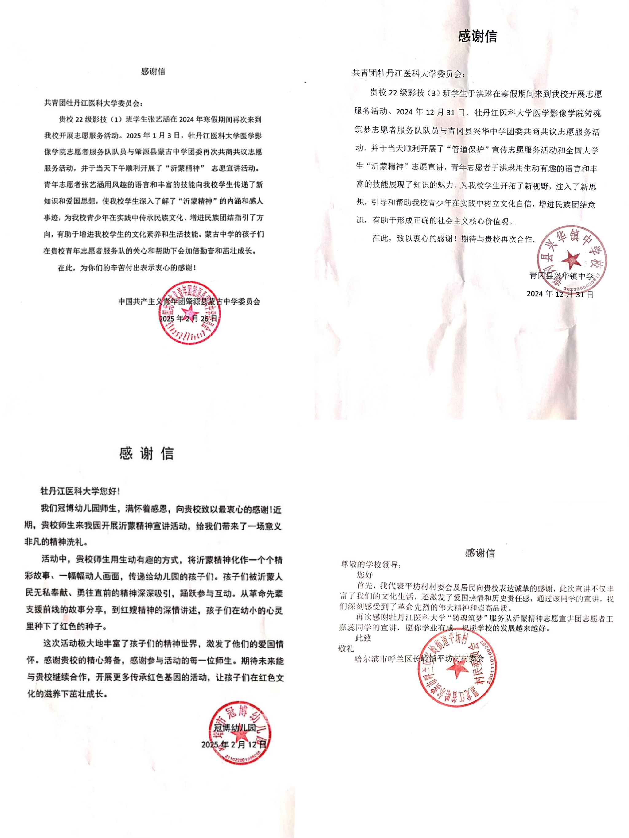 牡丹江医科大学医学影像学院铸魂筑梦志愿服务队以青春之名,架起历史与现实的桥梁。他们用脚步丈量红色热土,用智慧赋能乡村振兴,用创新激活文化传承,生动诠释了“请党放心,强国有我”的铮铮誓言。这场跨越时空的精神接力,不仅让沂蒙精神在新时代焕发绚丽光彩,更激励着牡医大莘莘学子勇担使命,书写无愧于新时代的璀璨华章。