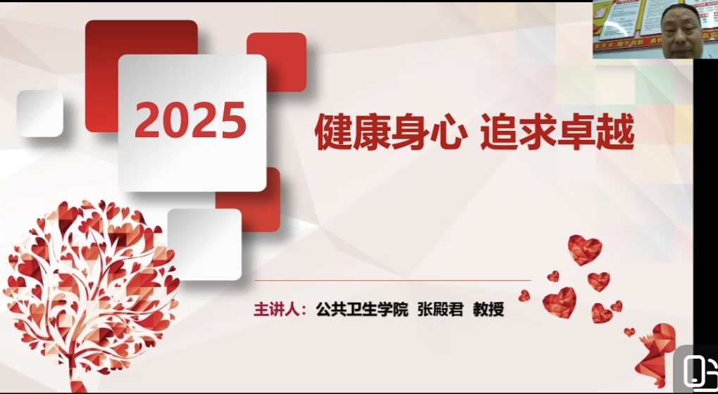 习近平总书记指出,人民健康是社会文明进步的基础,是民族昌盛和国家富强的重要标志,也是广大人民群众的共同追求。2025年4月25日,机关党委依托“业务大讲堂”活动,特邀请公共卫生学院临床心理教研室张殿君教授,以《健康身心 追求卓越》为主题,面向机关教职工及学校各基层党组织班子成员授课,大家齐聚线上,共同参与这场关乎身心健康的知识盛宴。