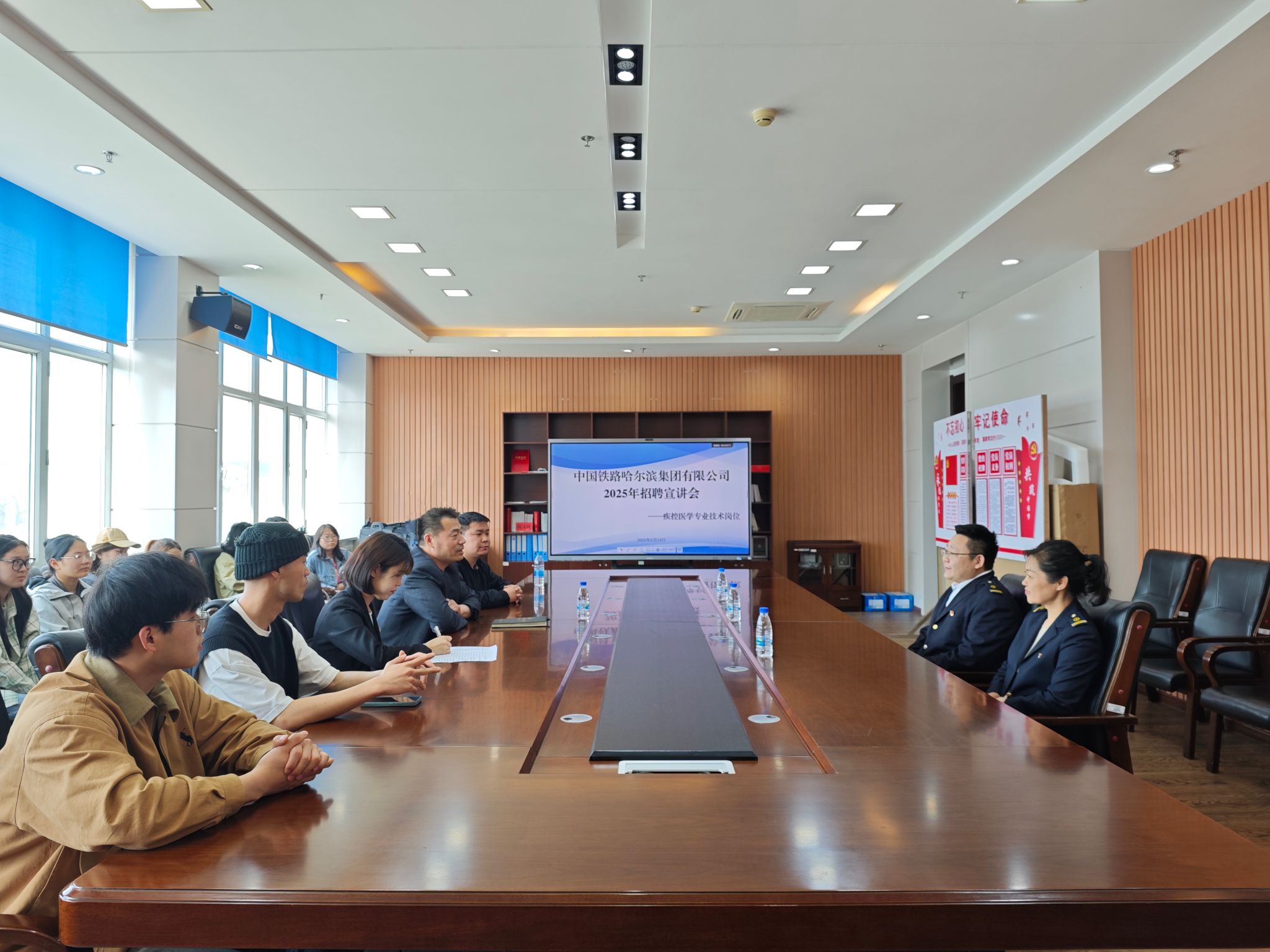 为全面贯彻落实党中央、国务院关于“稳就业”“促就业”决策部署,公共卫生学院持续推进产教融合纵深发展,拓展校企协同育人新路径。5月14日下午,学院联合哈尔滨铁路疾病预防控制中心牡丹江分中心在临床技能实训中心15楼会议室成功举办中国铁路哈尔滨集团有限公司2025年招聘宣讲会。学院党总支书记孙延斌、全体辅导员及2025届毕业生代表共同参会,与用人单位开展深度交流。