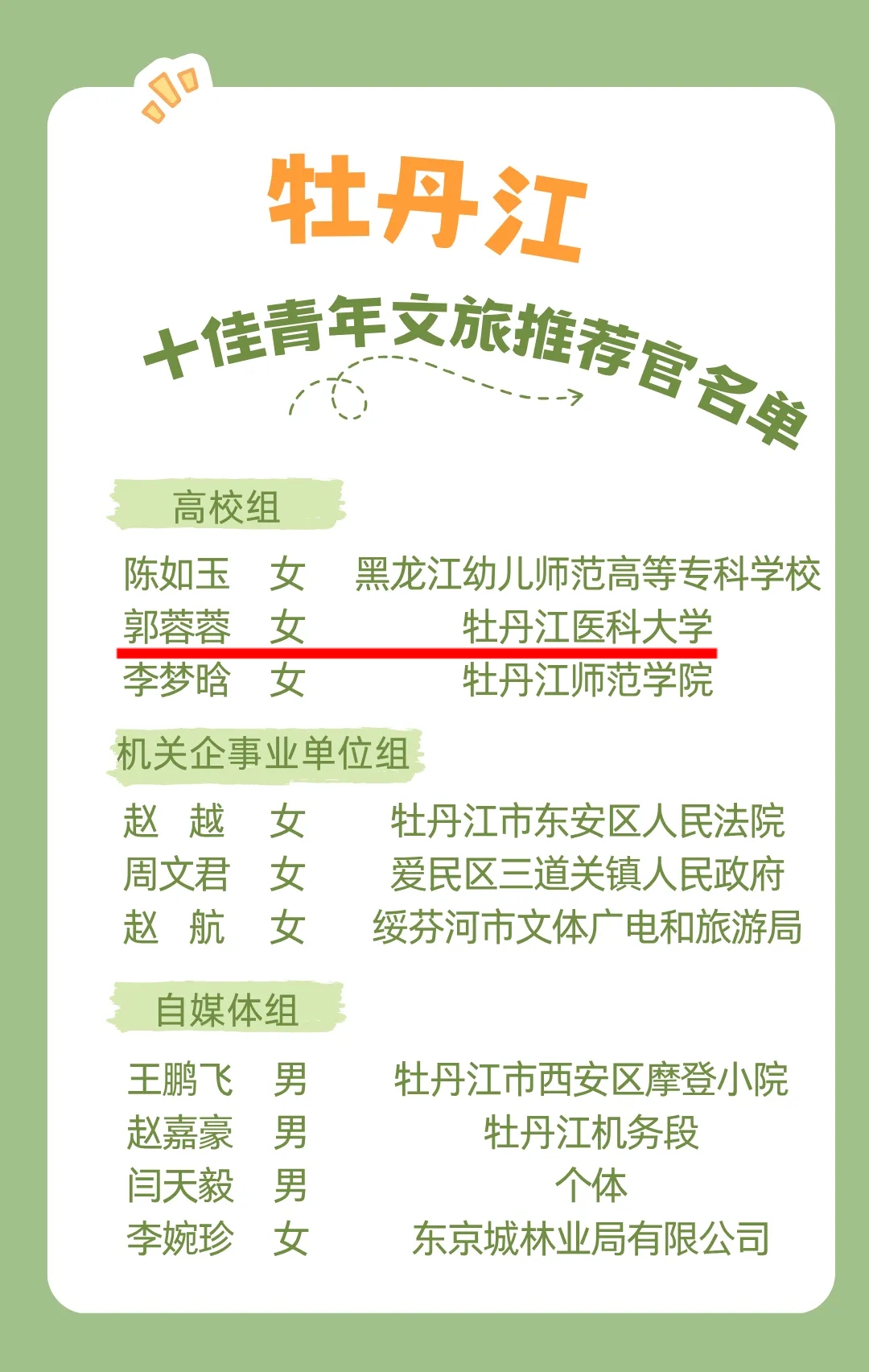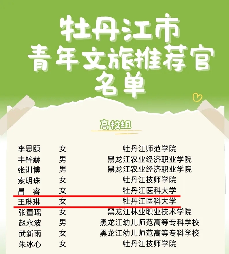 近日,由牡丹江市文体广电和旅游局、共青团牡丹江市委联合主办的牡丹江市青年文旅推荐官选拔赛圆满落幕。在这场展现青春风采与文旅魅力的赛事中,我校学子凭借出色的表现脱颖而出,三名参赛学生均被评为青年文旅推荐官,其中一名学生荣获“十佳青年文旅推荐官”称号。
