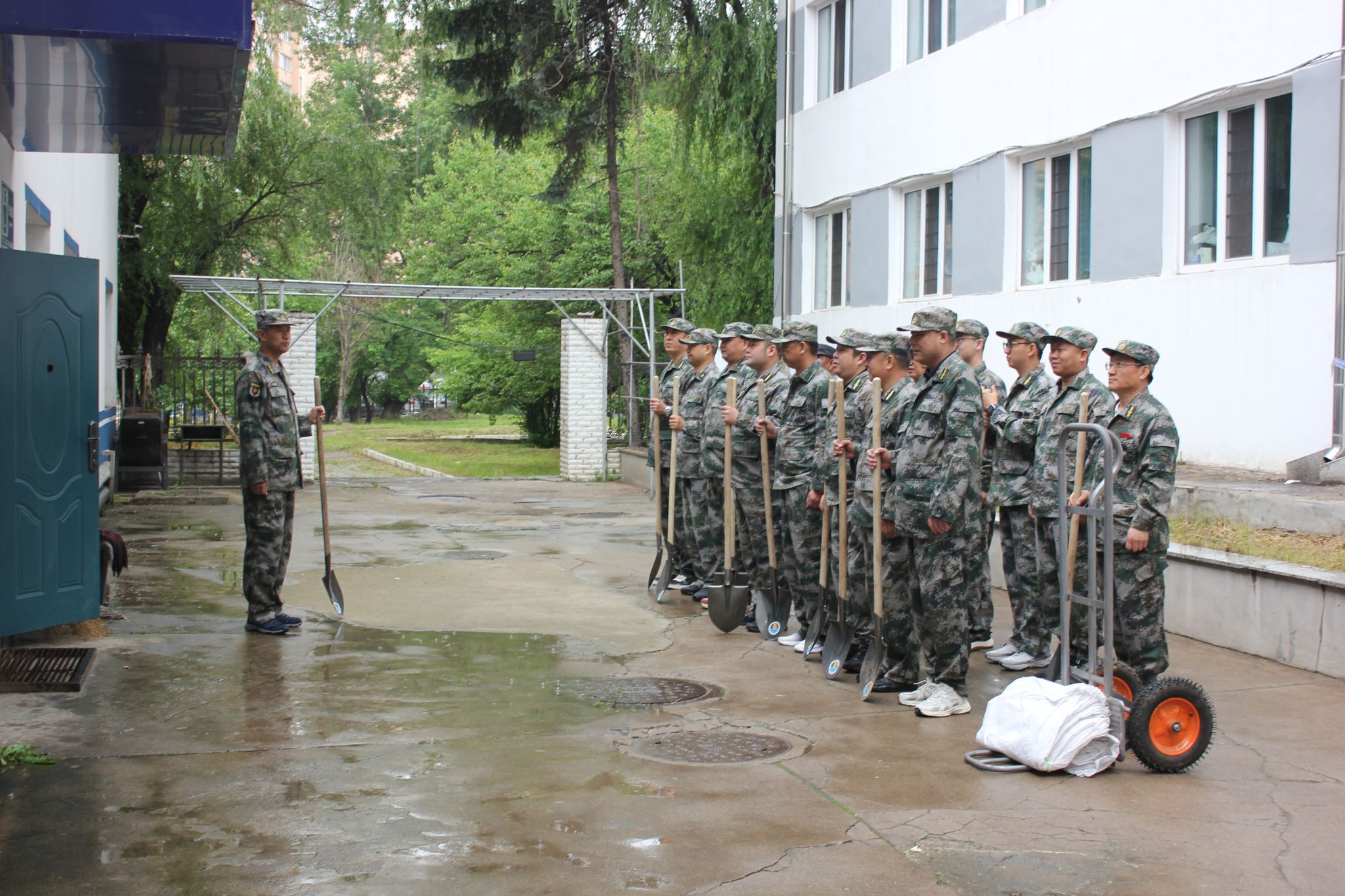 上午9时,保卫处值班人员启动预警,模拟发现险情。场景设定为连日暴雨导致雨水顺山体流下,保卫处物资库前排水不畅,积水严重,有进水的危险。值班人员立即将情况报告给领导小组,组长迅速宣布启动防汛应急预案。