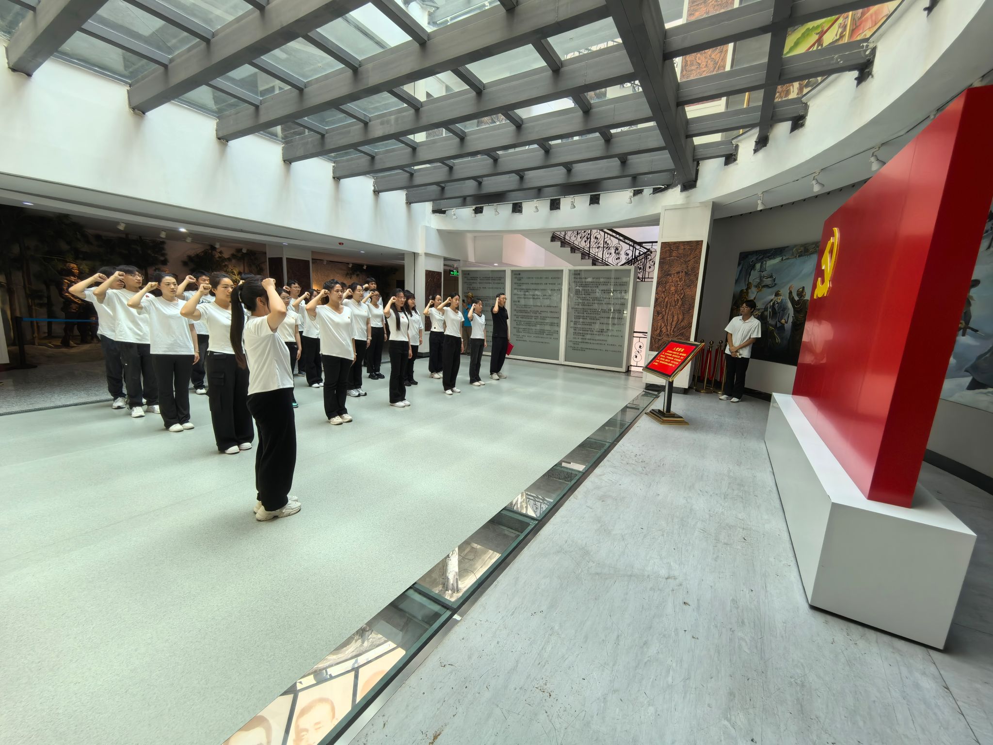 讲解结束后,入党宣誓仪式正式开展,仪式在激昂的《国际歌》声中拉开帷幕。随后万雷宣读了新党员名单,并为党员佩戴党员党徽。当金光闪闪的党徽别上衣襟,22颗年轻的心脏在“为人民服务”的初心召唤下有力跳动。随后,在辛胜男的领誓下,全体人员面向党旗,右拳高擎,“我志愿加入中国共产党……”的誓言铿锵有力,在纪念馆穹顶下久久回荡。领誓人读到“宣誓人”时,22个名字铿锵报出,仿佛是对历史的回应,对未来的承诺。