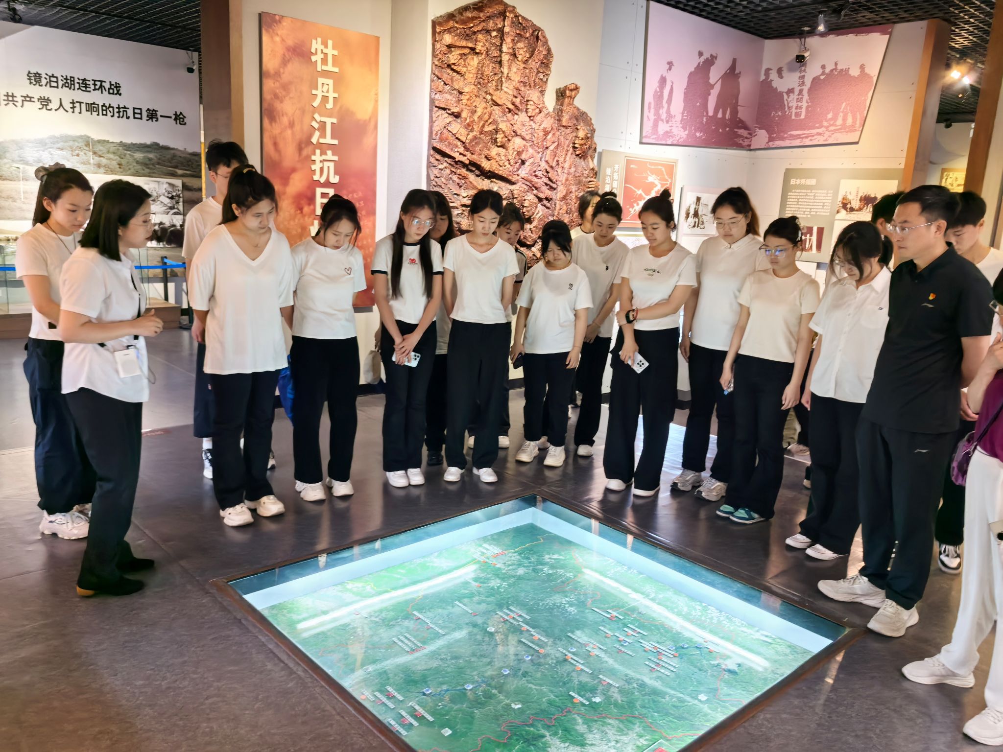 八女投江纪念馆内,泛黄的文献史料与英烈塑像在晨光中静默矗立。仪式伊始,全体人员跟随讲解员的脚步,重温以“八女投江”为代表的抗联先烈事迹。当目光掠过陈列柜中残破的军装与泛黄的家书,新党员们仿佛穿越到那段血火交织的岁月—冷云等八位女战士毅然投身乌斯浑河的壮举,化作永不褪色的精神丰碑,在讲解员“一寸山河一寸血”的讲述中,深深烙印在每位青年心中。