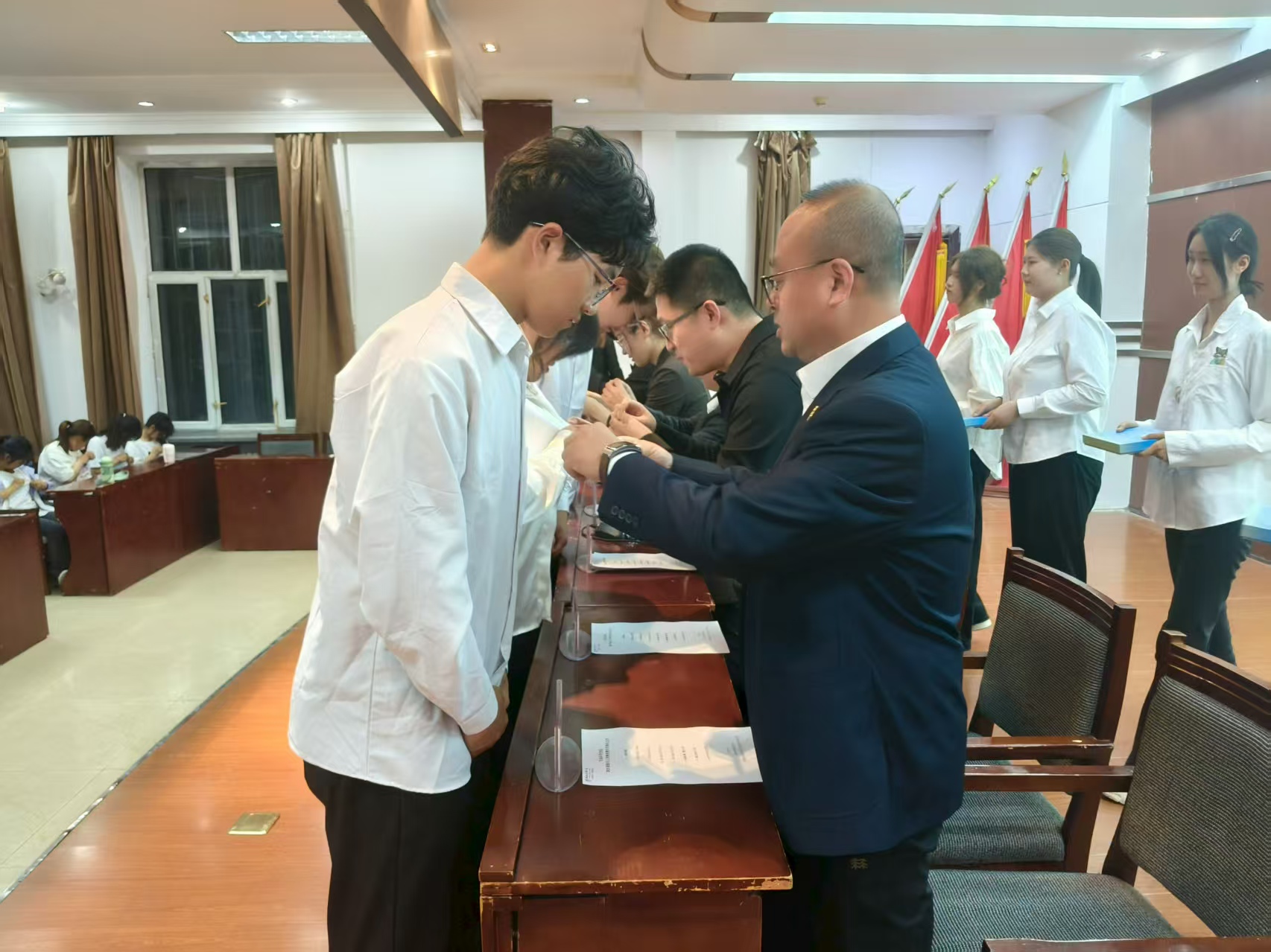 在舒缓悠扬的音乐声中,老师们面带微笑,亲手为新生代表佩戴上牡丹江医科大学校徽,并送上精心准备的礼物。当小巧而意义非凡的校徽别在胸前的那一刻,新生们的眼中满是自豪与憧憬,这一枚枚校徽如同希望的火种,将在他们的青春岁月里熠熠生辉,引领他们开启崭新的人生篇章。随后,全体新生庄严宣誓,铿锵有力的誓言在会场中回荡,展现出他们对未来学习生活的坚定信念与无畏勇气。