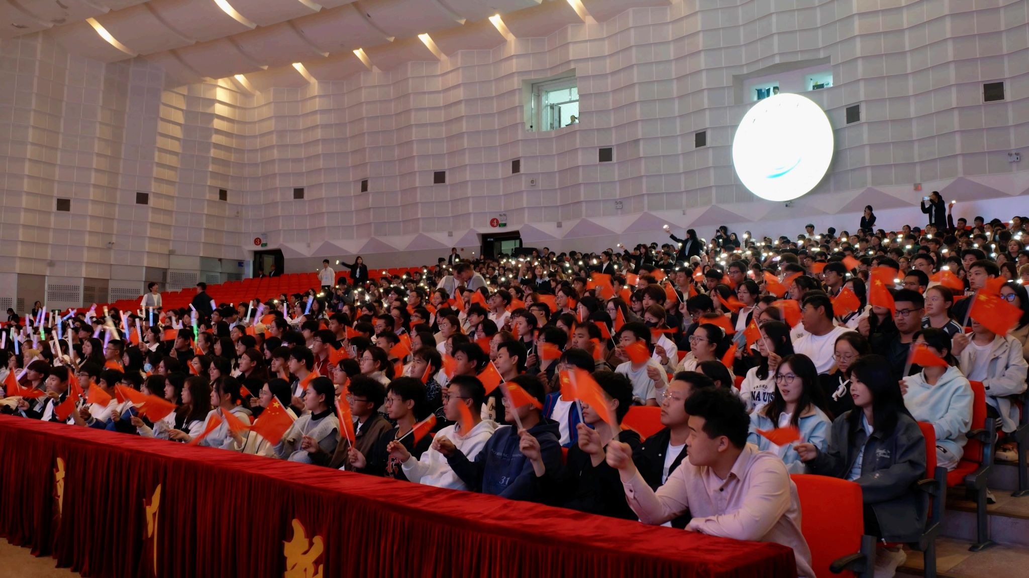 晚会以《我和我的祖国》开篇,真挚歌声瞬间点燃全场爱国热情,台下师生轻声跟唱,红色情愫悄然蔓延。朗诵节目《不朽》则以铿锵有力的语调、饱含深情的演绎,带领大家回望抗战烽火岁月,唤醒心中对革命先烈的崇敬与缅怀。随后多组红色节目依次呈现,合唱、朗诵交替上演,回望抗战岁月、唤醒对先烈的崇敬缅怀,红色精神在简约而真挚的演绎中浸润人心。当《红旗飘飘》奏响,晚会氛围推向高潮。台下国旗与荧光棒交织成炽热海洋,鲜红国旗在灯光下熠熠生辉,荧光如繁星闪烁,师生们眼神坚定、面带自豪,歌声与欢呼声此起彼伏,每一处互动都是青春与祖国同频共振的生动写照,满是对祖国的热爱与对先烈的致敬。《我爱你中国》《有我》《青春中国》《明天会更好》等节目,或诉深情眷恋,或展青年担当,或绘青春朝气,或寄未来期许,温馨的拍手互动、激昂的情感传递,让会场始终充盈着温暖与希望,红色信仰在旋律与诵读中不断升华。晚会最后,辅导员李璐与耿瑞为大家带来《不忘初心》,这份“师者初心”与“学子担当”的碰撞,让红色信仰的传承更显真切,为晚会画上圆满句号。