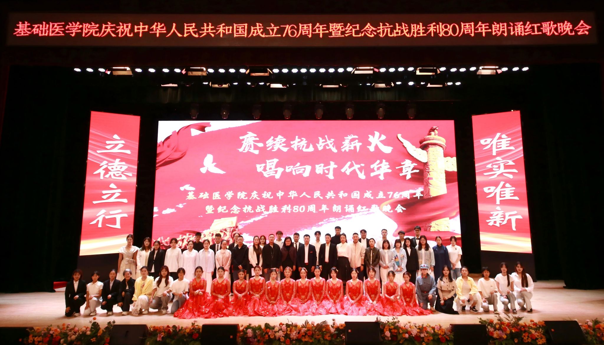 为传承红色基因、厚植家国情怀,2025年9月26日,基础医学院于学校“一站式”学生社区文体活动中心精心举办“赓续抗战薪火 唱响时代华章”庆祝中华人民共和国成立76周年暨纪念抗战胜利80周年朗诵红歌晚会。牡丹江医科大学学生工作部(处)部(处)长王俊林,基础医学院党委副书记刘颖及基础医学院全体辅导员参加晚会,与同学们共同沉浸在红色旋律与经典诵读的热烈氛围中。