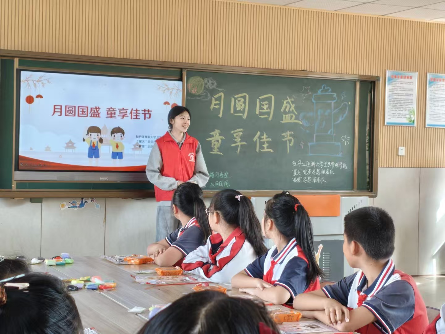 为贯彻落实党的二十大精神,提升党建带团建引领力和组织力,发挥党员团员先锋模范带头作用,凝聚青春力量,为党带团赋能。2025年9月26日,卫生管理学院组织“星火”党员志愿服务队和“春泥”志愿服务队走进林口县柳树镇小学开展“月圆国盛,童享佳节”志愿服务活动。卫生管理学院党委书记范秀坤和团委负责人李晓晨带队参加。