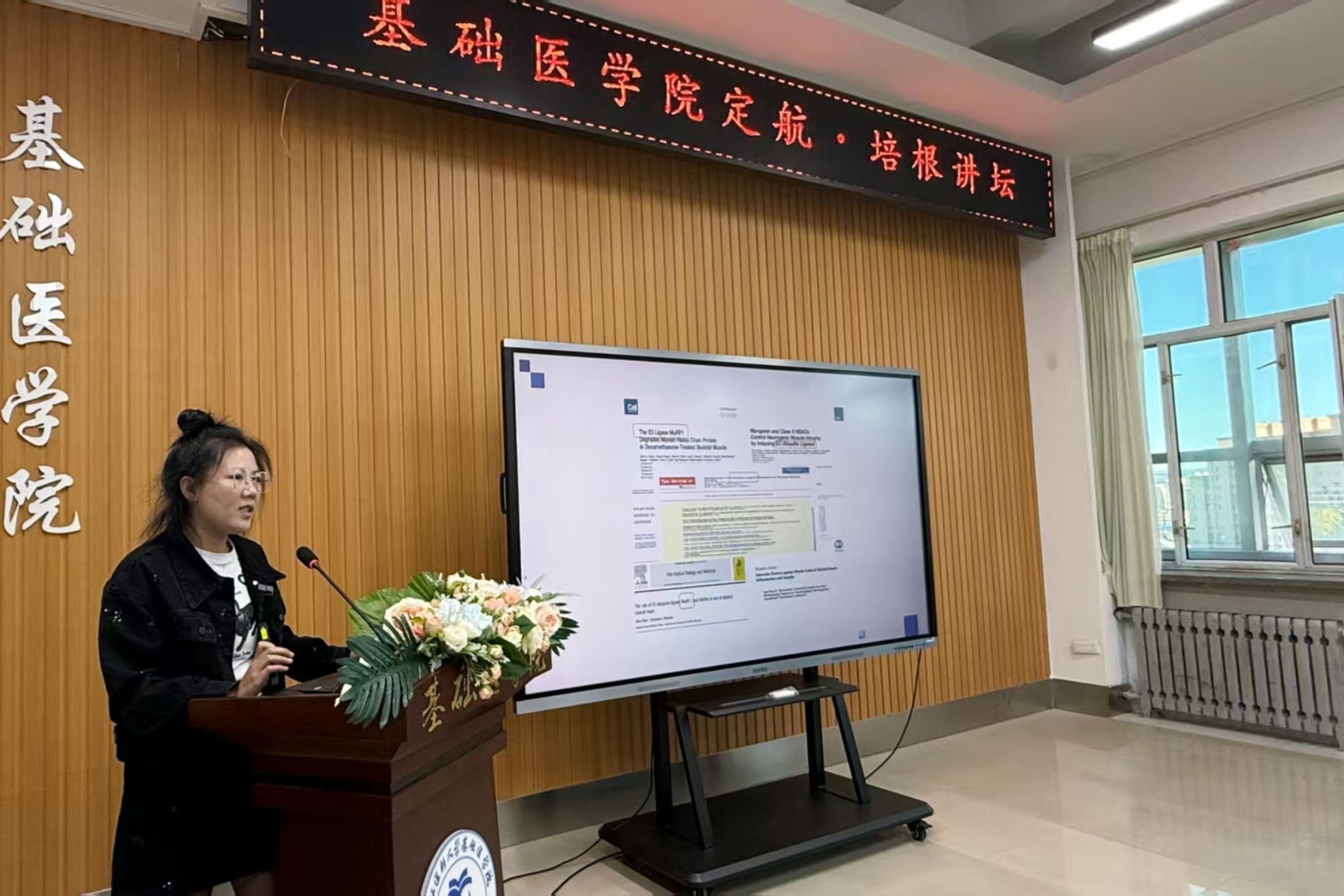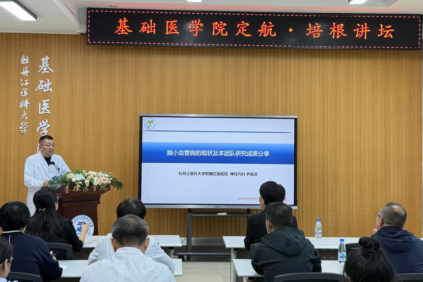 首场报告会特邀牡丹江医科大学附属红旗医院院长、国家临床重点专科神经内科带头人、“龙江名医”尹昌浩教授,与我院青年导师、病理生理学教研室陆芳平博士联袂开讲。尹昌浩教授以《脑小血管病的现状及研究》为题,系统梳理了脑血管病精准诊疗面临的瓶颈,并提出“临床问题—基础攻关—技术回归”的闭环研究范式;陆芳平博士则结合其实验室最新成果,分享了《H₂S靶向巯基化修饰MuRF1缓解2型糖尿病骨骼肌萎缩的机制研究》,展示了基础研究与临床应用双向奔赴的生动案例。两场报告内容翔实、逻辑严密,既展示微观机制深度,又凸显临床转化温度,激发基础与临床教师围绕“跨学科团队、交叉研究”展开热烈讨论,共绘协同创新蓝图。