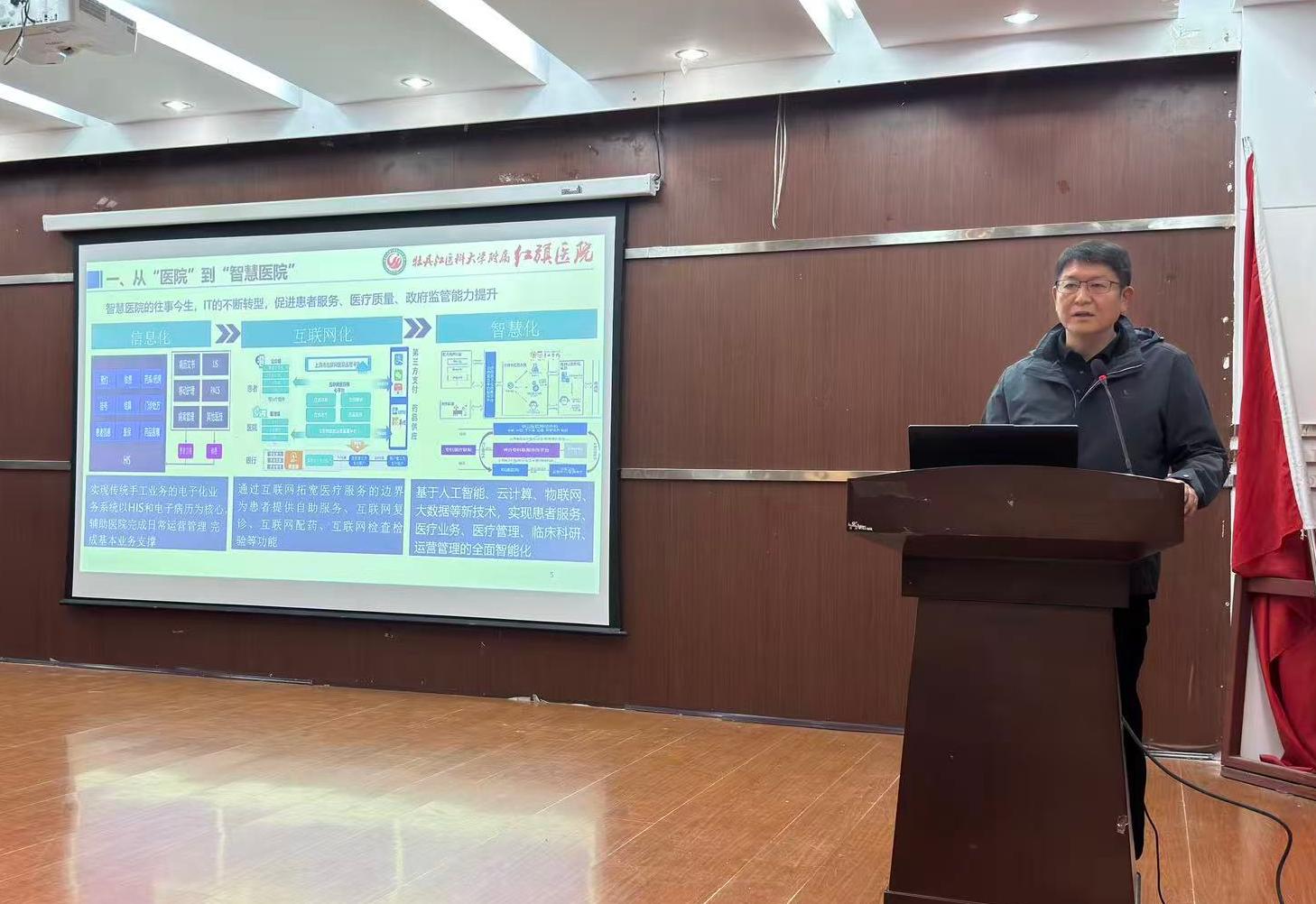 大会特别邀请了附属红旗医院信息科宋铁石主任作专题报告,以“医院智慧化建设”为例,“医疗信息化发展趋势”“信息管理人才在智慧医院建设中的作用”“医疗大数据与人工智能应用前景”等热点问题,生动分享了行业前沿动态与实践经验,展现了专业知识在医疗健康领域的广泛应用与价值,极大地激发了同学们的学习兴趣。