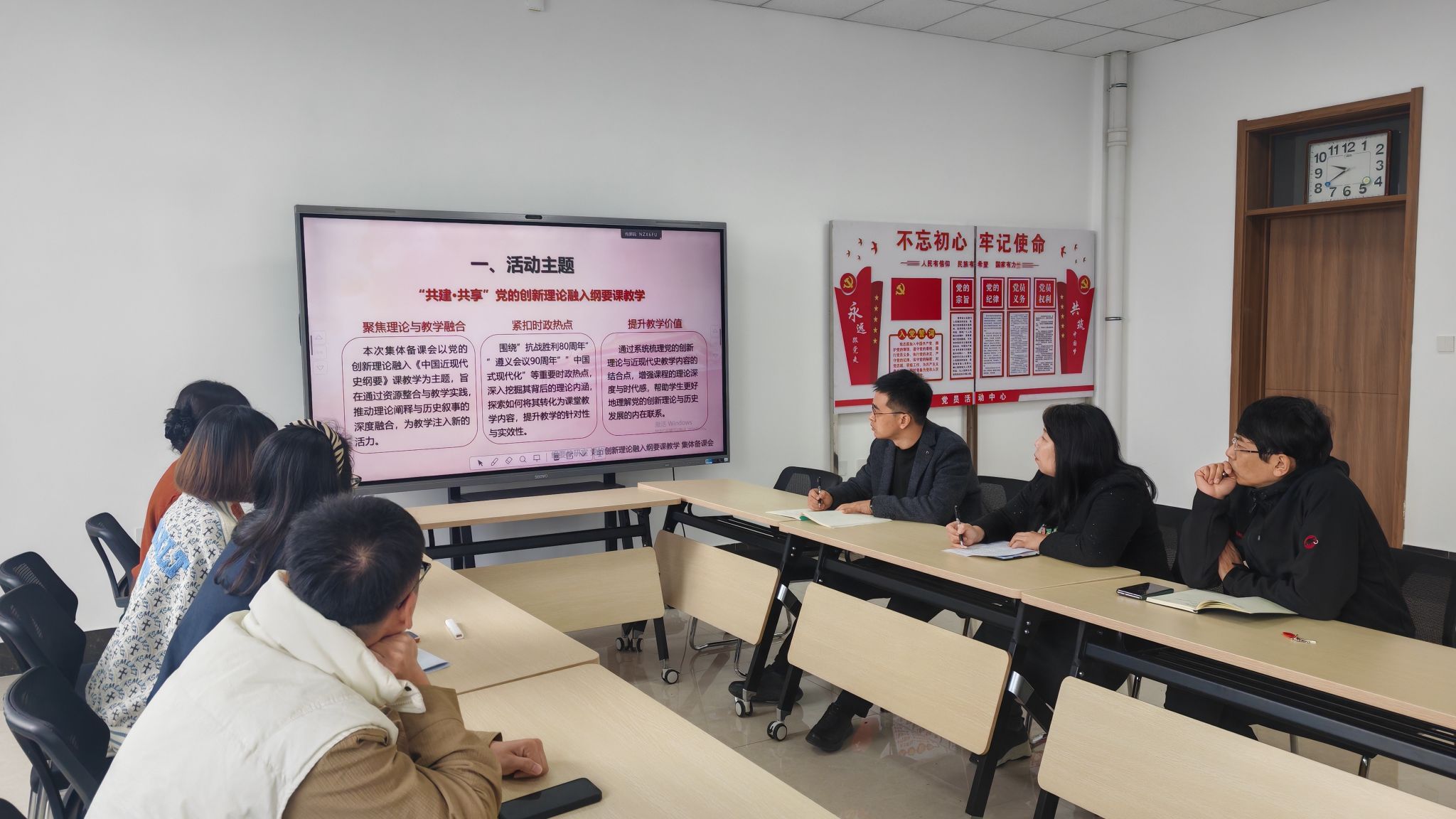 为深入贯彻落实新时代高校思想政治理论课改革创新要求,持续提升“中国近现代史纲要”课(以下简称“纲要”)的教学质量与育人实效,10月15日,我校马克思主义学院纲要教研室在1119会议室成功举办了以“‘共建·共享’党的创新理论融入纲要课教学”为主题的集体备课会。马克思主义学院院长杨帆、副院长王伟莅临指导,与教研室全体教师齐聚一堂,通过深度研讨与智慧碰撞,共同探索党的创新理论体系化、学理化、精准化融入教学实践的有效路径。
