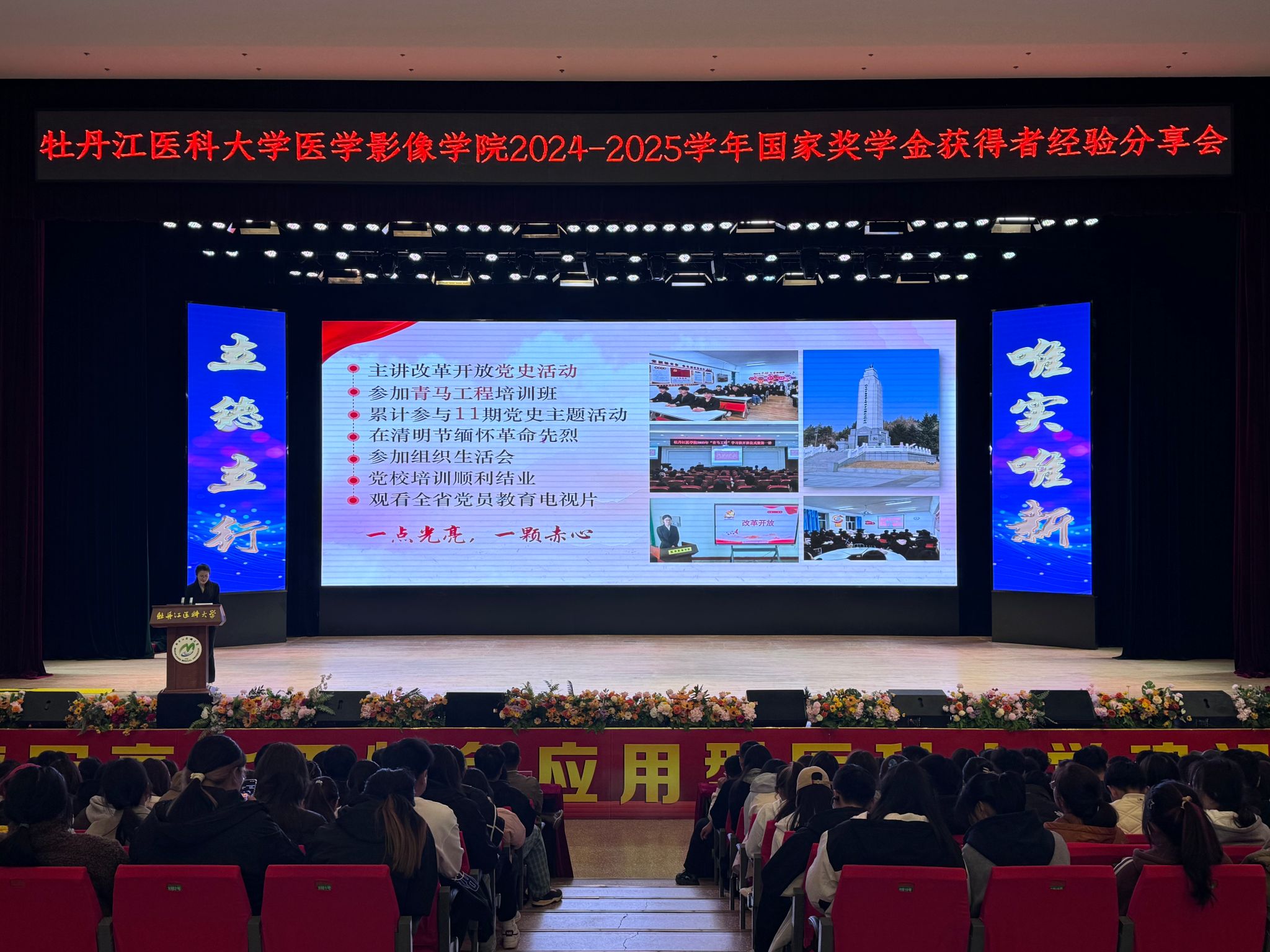 为充分发挥国家奖学金获得者的榜样力量,营造积极向上的学习氛围,10月17日,医学影像学院在文体馆举办国家奖学金获得者经验分享会。本次分享会邀请2024-2025学年国家奖学金获得者覃奇、罗雨萱、李芳菲、丁悦、皮豪杰,他们从不同角度分享了自己的成长历程与学习心得,医学影像学院2024级、2025级1200余名学生及全体辅导员参会。