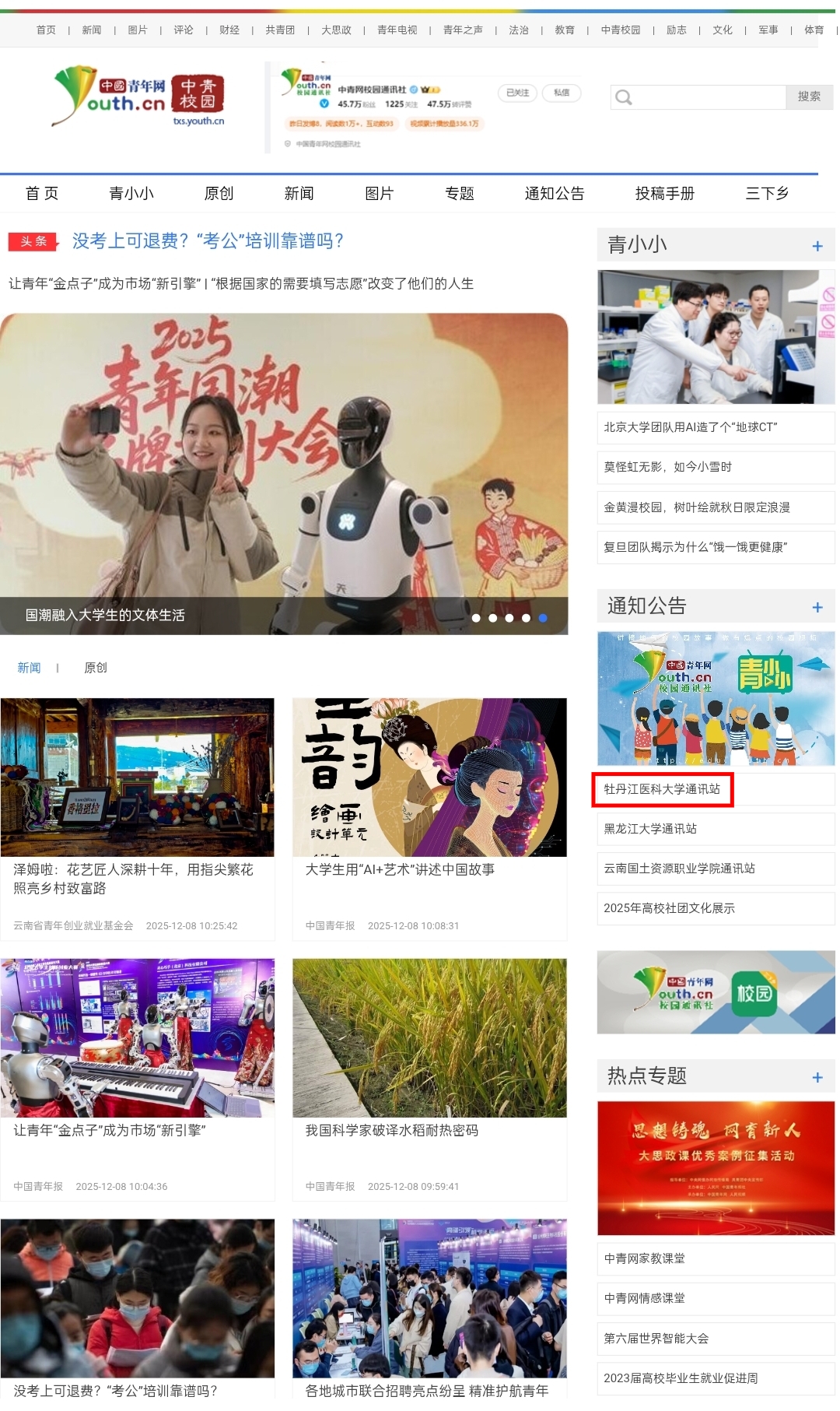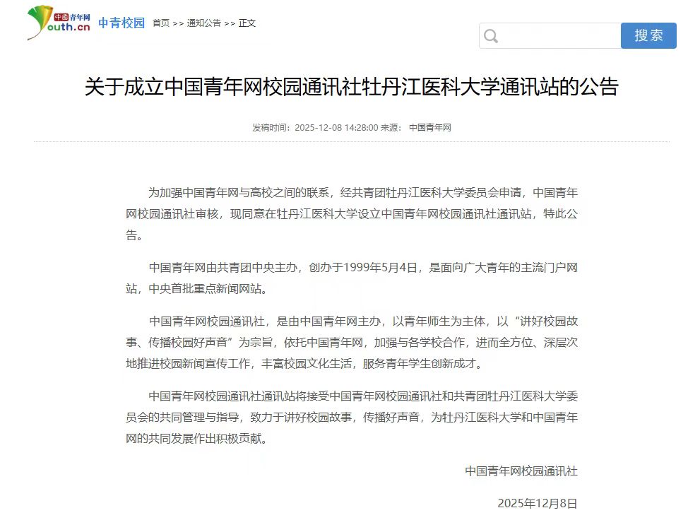 经校团委积极申报、中国青年网校园通讯社严格审核批准,2025年12月8日,中国青年网校园通讯社牡丹江医科大学通讯站正式获批成立,标志着我校共青团思想引领阵地与校园文化传播体系建设取得了阶段性成果。