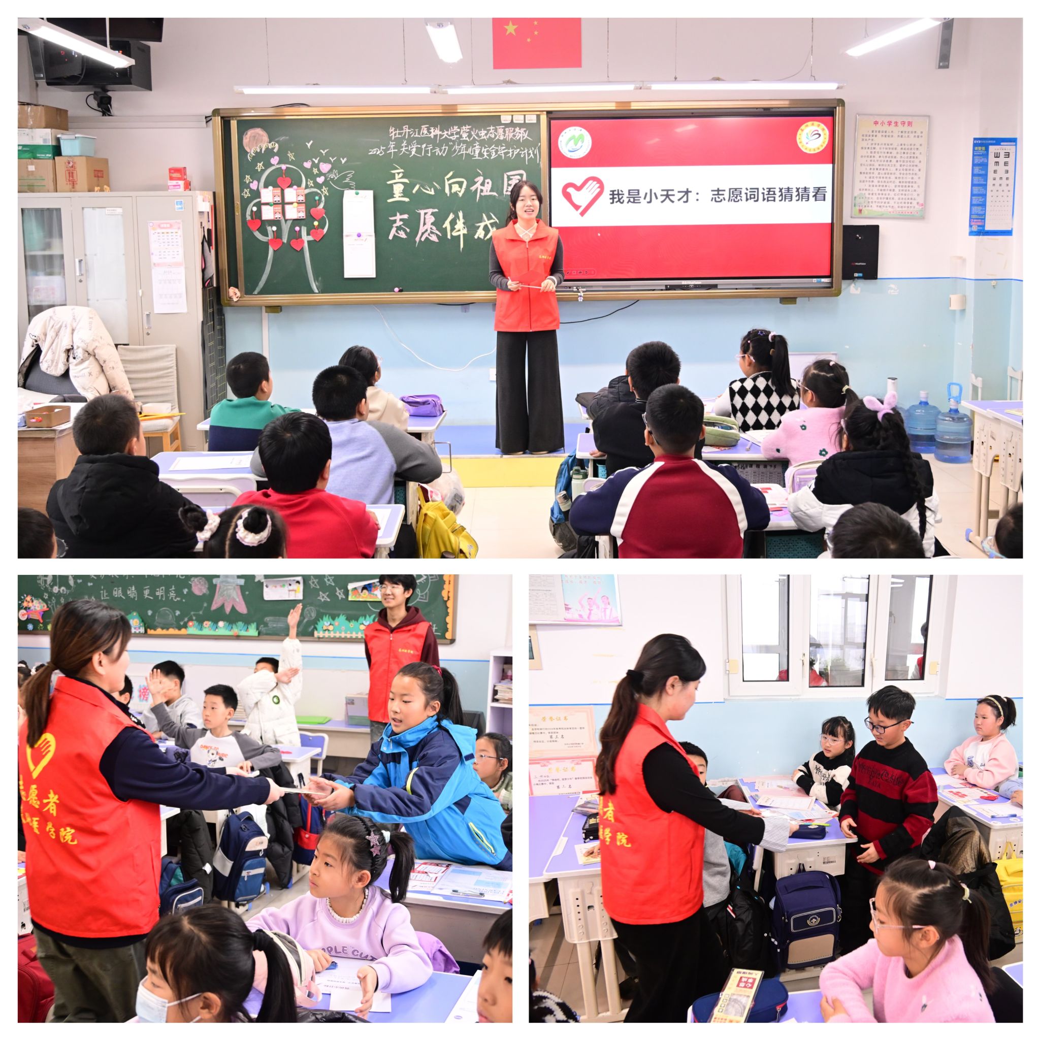 牡丹江医科大学基础医学院萤火虫志愿服务队积极响应团中央以及团省委号召,在学校团委的大力支持下,开展2025年“少年儿童安全守护计划”思想引领宣讲活动。2025年12月19日,萤火虫志愿服务队在指导教师唐懿鸣、队长李淇的带领下走进牡丹江市爱民区师范附属小学,开展主题“童心向祖国·志愿伴成长”的思想引领宣讲志愿服务活动。