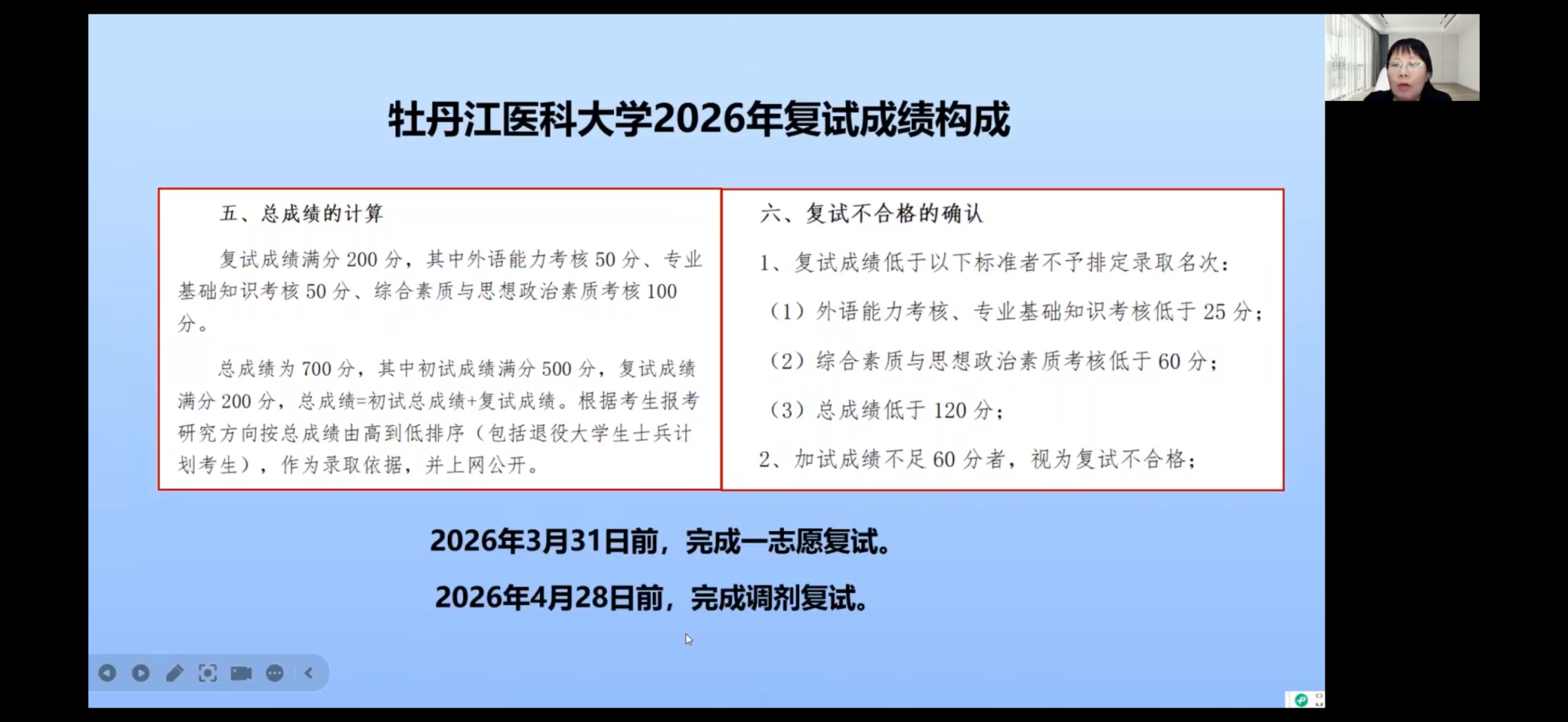 为助力2026届考研学子精准备考、从容应考,第一临床医学院于3月17日、19日、20日线上举办三场考研复试指导系列讲座。讲座特邀附属红旗医院眼病中心主任胡姗姗博士、基础医学院副院长宋洁教授、附属红旗医院麻醉科夏洪莲老师担任主讲嘉宾,为备考学子送上干货满满、针对性极强的复试备考指南。