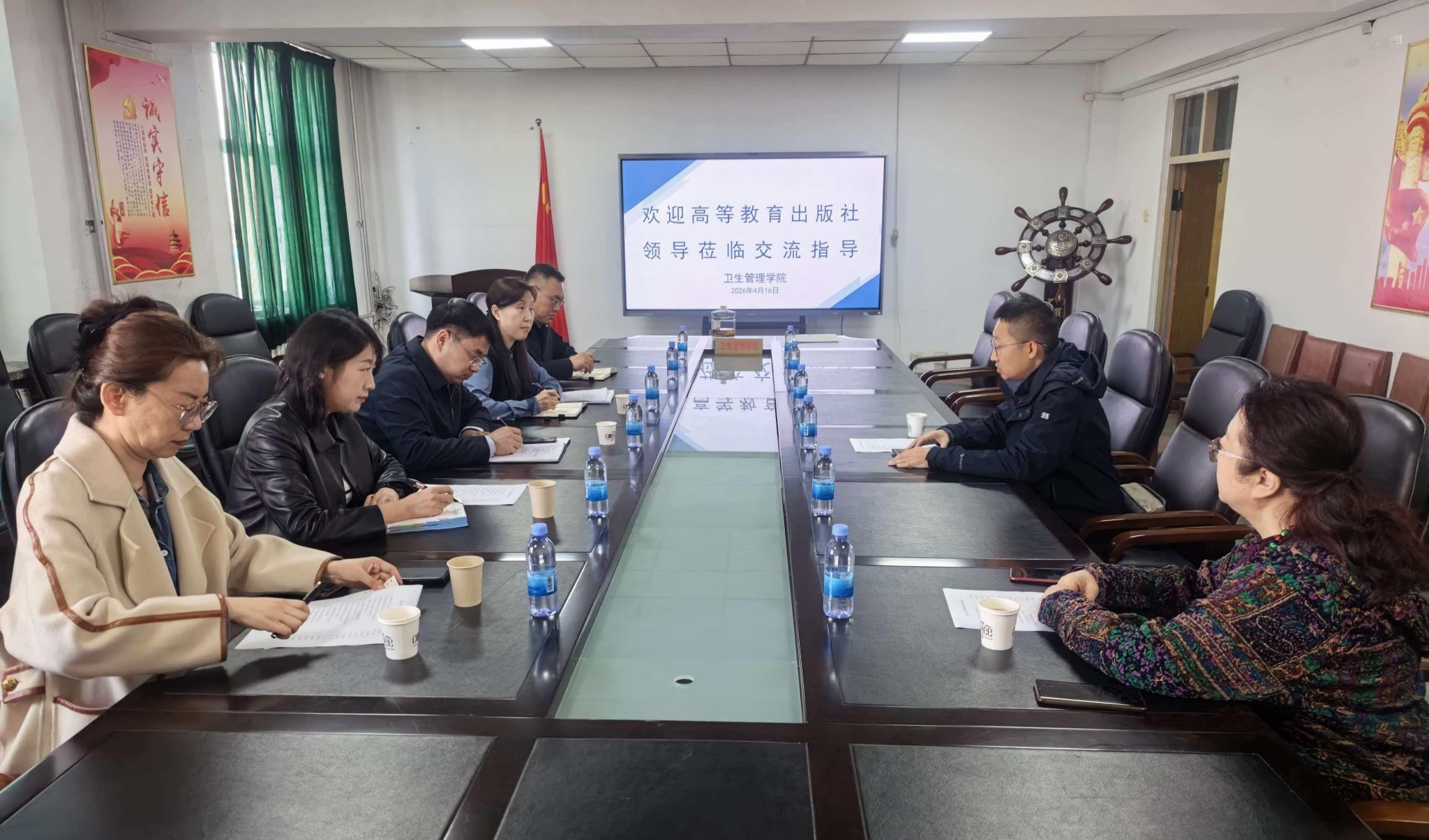 4月16日上午,卫生管理学院院长师东菊,公共卫生学院院长荣胜忠,教务处教材科科长刘阳,卫生管理学院副院长卢国强、公共卫生学院教务科科长刘冬雪与高等教育出版社黑龙江教学服务中心副主任李鑫举行合作会谈,双方围绕“寒地老年康养”系列教材的出版工作展开深入交流。