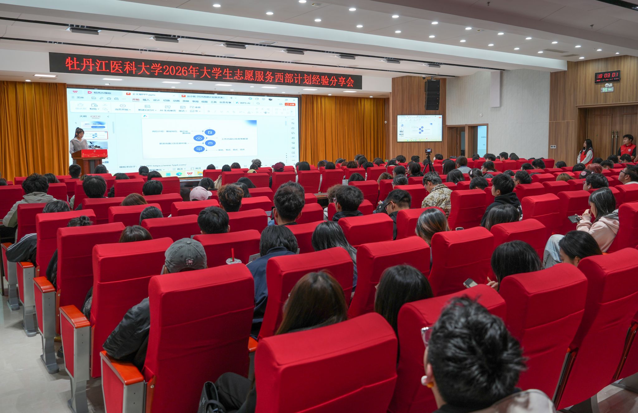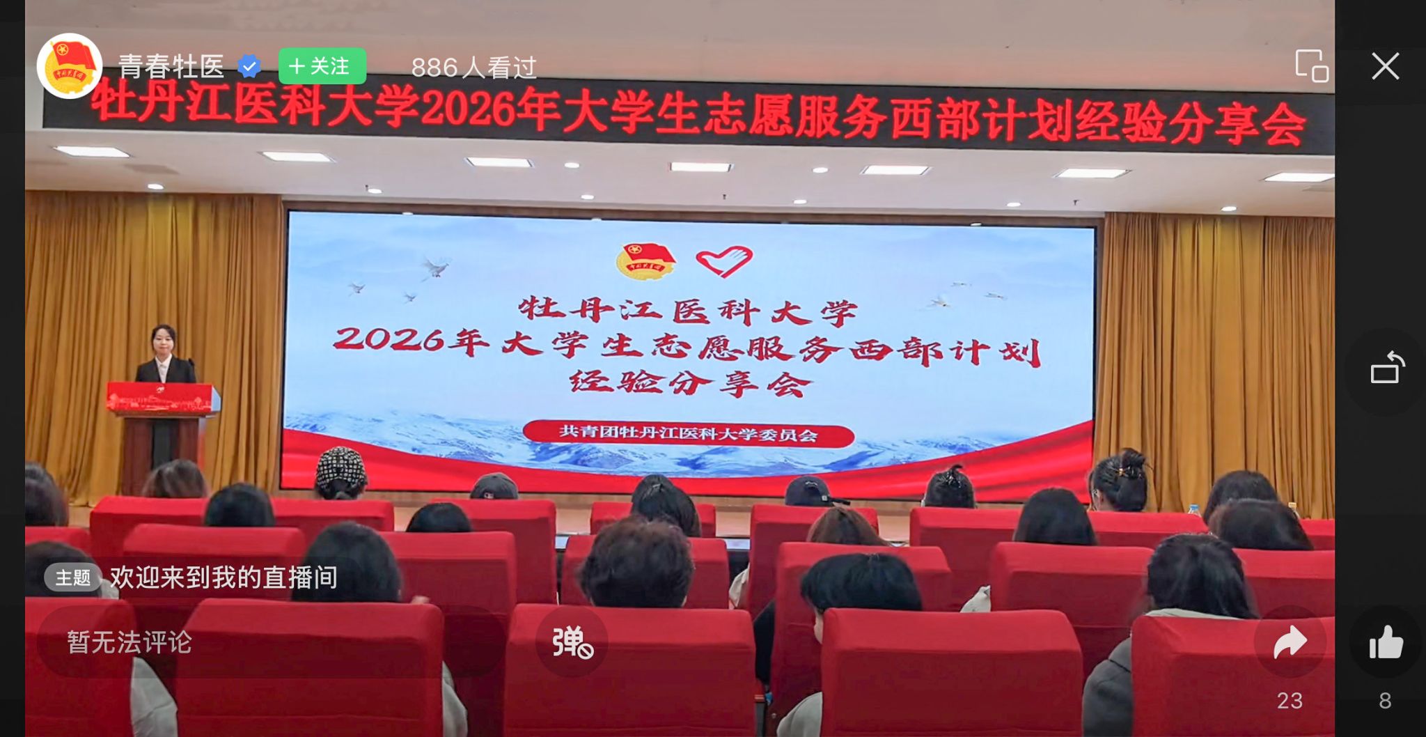 为深入宣传西部计划相关政策,弘扬志愿服务精神,引导牡医大青年扎根基层、服务西部,4月22日,学校团委在公卫大楼十二楼会议室举办2026年西部计划经验分享会。活动采用“线下主会场+线上直播”形式同步进行,线上观看人数超800人,线下秩序井然、互动氛围浓厚。