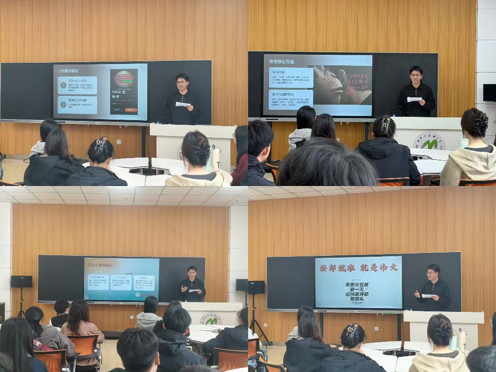 孟庆贺作总结发言。勉励备考学子借鉴优秀经验,结合自身情况制定科学复习计划,坚定考研目标,合理规划时间、调整心态,以踏实勤勉的态度备战考研。学院将持续搭建学业帮扶平台,全力为学子考研之路保驾护航。