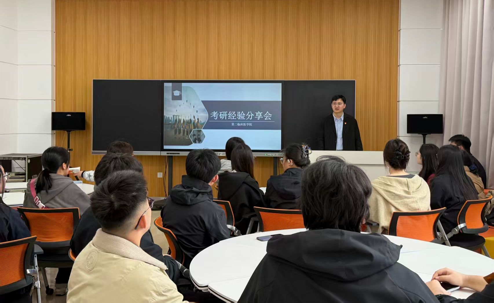 为扎实推进学院学风建设,精准助力医学考研学子明晰备考方向、掌握科学复习方法、缓解备考焦虑,4月23日,第二临床医学院“一站式”学生社区成功举办考研经验分享会。本次活动由辅导员孟庆贺主持,特邀2021级优秀学子杨培博(初试成绩406分、录取吉林大学)、严嘉美(初试成绩346分、录取暨南大学)担任主讲,2023级备考学生到场参与学习。