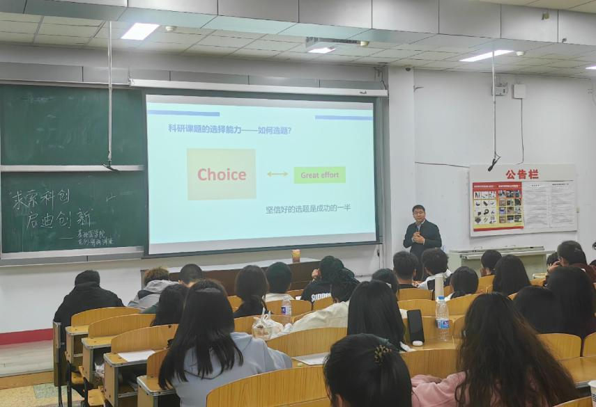 为提升学生的科研能力,激发本科生的科研热情,基础医学院于4月24日18:00在基础楼阶梯二教室开展了“求索科创 启迪创新”系列科研讲座之一。本次讲座由科研处副处长荣胜忠教授主讲。辅导员李璐主持。