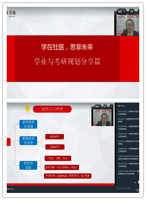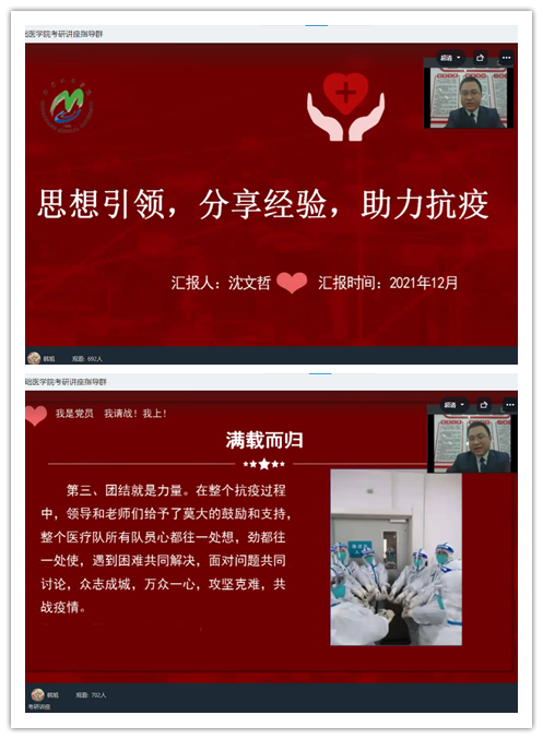 在共同抗疫的大背景下,为进一步加强学风建设,2021年12月7日晚上18点,基础医学院学生党总支精心组织了考研、抗疫专题在线讲座,本次讲座邀请到的是我校获得国家奖学金的2020级研究生范苗苗、沈文哲,基础医学院2019级、2020级、2021级共700余名学生参与本次讲座。