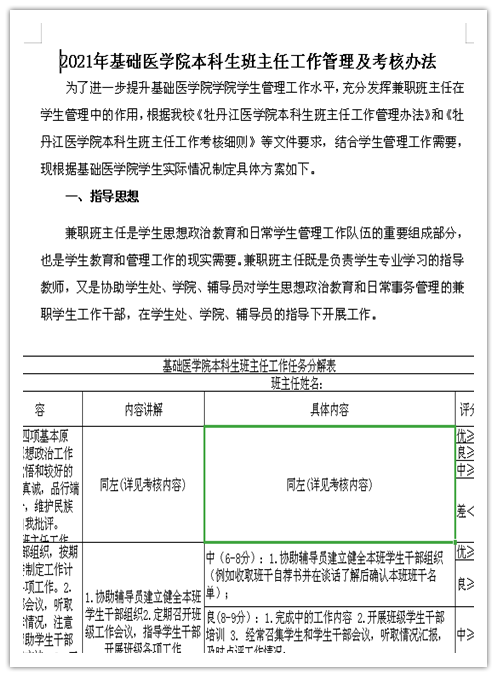 唐懿鸣首先向大家科学解读了《牡丹江医学院本科生班主任管理和考核办法》,接着对《基础医学院本科生班主任工作任务分解表》里的工作要点和注意事项进行了详细说明。随后是交流环节,与会人员针对相关文件及具体任务进行了交流研讨。最后石杰对会议做简要总结,她提出第一要密切服务大局,有“全员一盘棋”的意识;第二是责任重于泰山,要将教书育人的理念内化于心、外化于行;第三是关键在于行动,将思政融入课堂、走访要进寝室、多与学生交流,与辅导员通力合作,共同做好班级管理工作。