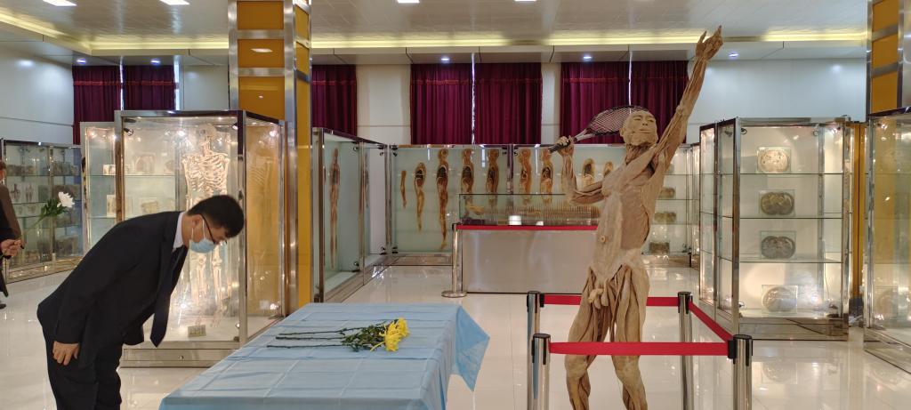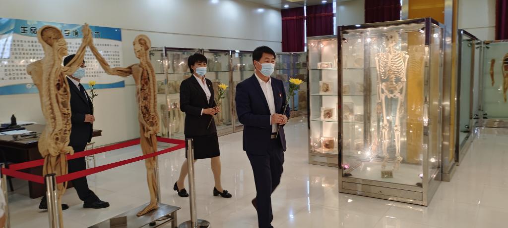 献花仪式后,孙荫众勉励大家,要感同身受地体会大医精诚和医者仁术的深刻内涵和高尚情操,从尊重生命、敬畏生命、珍惜生命的观念出发,培养医学生对救死扶伤职业道德的内在认同,把救死扶伤的职业目标变成医学生的理想信念,通过大学的勤奋学习、刻苦磨砺,使自己能够尽早成为一名医术高明、医德高尚的医生。此次主题教育活动很有意义,不仅能够激发起学生的学习兴趣,还能起到示范效应,在基础医学院党委和解剖党支部党员的带领下,将课程思政延伸到课外,让思政教育无处不在。孙荫众还叮嘱解剖教研室教师,生命奥秘科学馆馆藏的每一件标本都是一笔珍贵的财富,一定要维护好、保养好,让它们发挥出最大的价值。