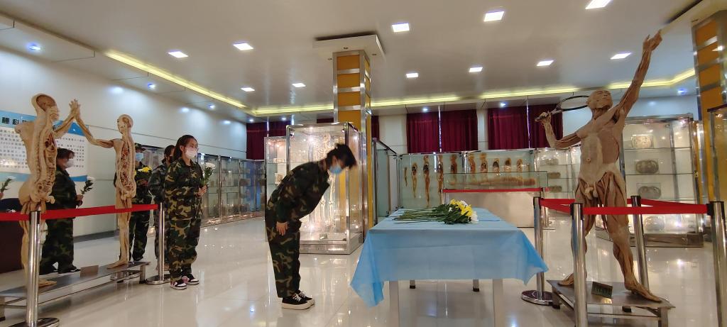 在解剖学教研室主任杨春壮的主持下,全体师生依次在“大体老师”前,默哀、鞠躬、献花,共同缅怀遗体捐献者,感恩和致敬默默无闻的大体老师,献给大体老师最高的人格尊严和最大的人文关怀。