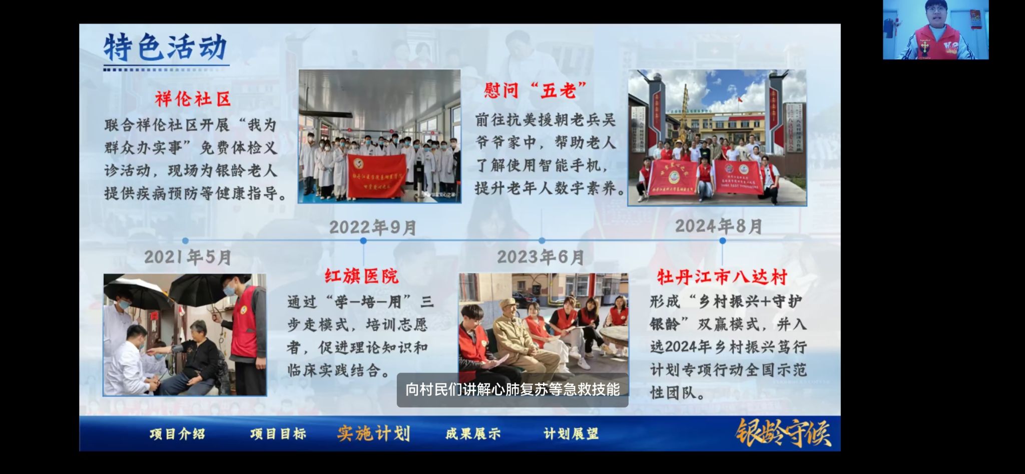 “银龄守候”健康护航志愿服务项目是牡丹江医科大学基础医学院甘棠爱心之家开展的一项以提升当地银龄人群健康水平、促进在校大学生参与社会实践教育的一项综合性志愿服务活动。此项目主要包含四种方式,包括“义诊+科普”形式志愿服务活动、敬老院基础健康筛查、导诊志愿服务活动和“三下乡”华彩乡村卫生宣讲。服务对象涵盖敬老院老人、社区居民、乡村百姓及医院就诊患者四大人群。医疗志愿服务项目的开展,让在校大学生依托医学院校资源,发挥自身能力和优势,培养了他们的仁爱之心、沟通能力和团队协作精神,为未来的医疗职业生涯奠定了坚实的基础。