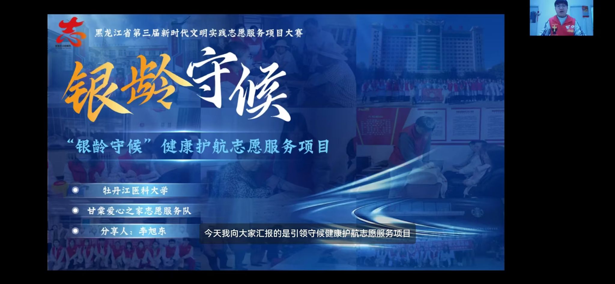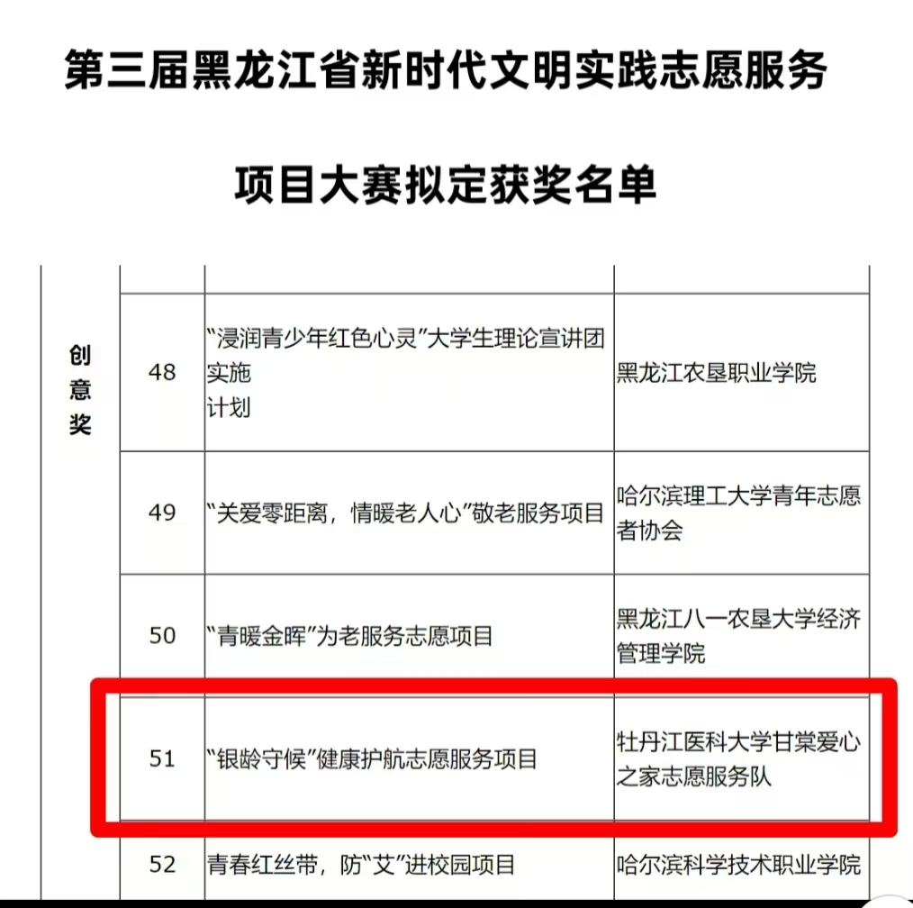 近日,由省委社会工作部、省委宣传部(省文明办)举办的第三届全省新时代文明实践志愿服务项目大赛落下帷幕。经过申报推荐、资格审查、评委终评等环节比拼,由牡丹江医科大学基础医学院学生党总支第一学生党支部书记万雷指导,甘棠爱心之家2023级临床17班学生李旭东带领团队参与的“银龄守候”健康护航志愿服务项目,在全省500余个项目中脱颖而出,荣获大赛创意奖。